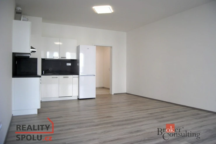 Byt je plně vybavený (kuchyňská linka, spotřebiče, pračka, šatní skříň).