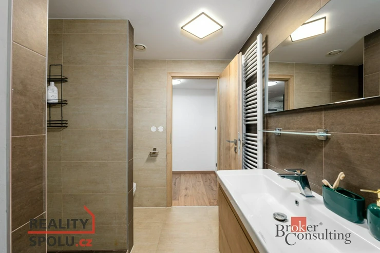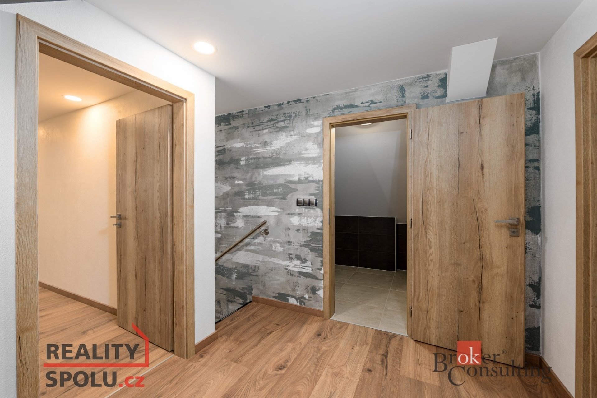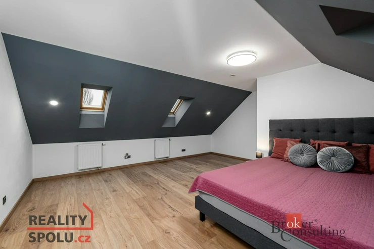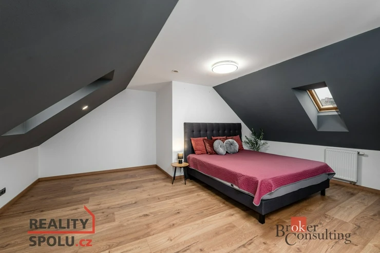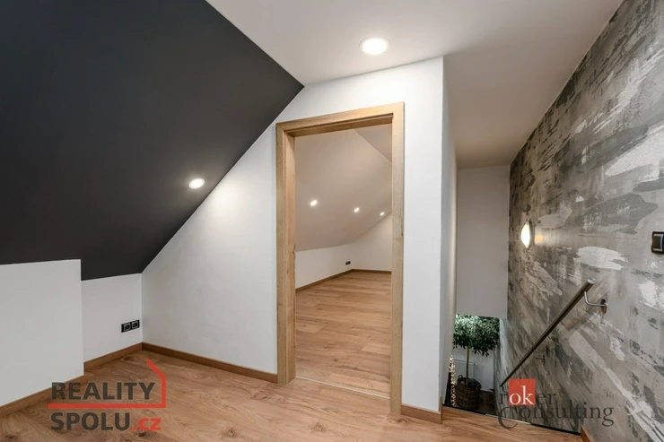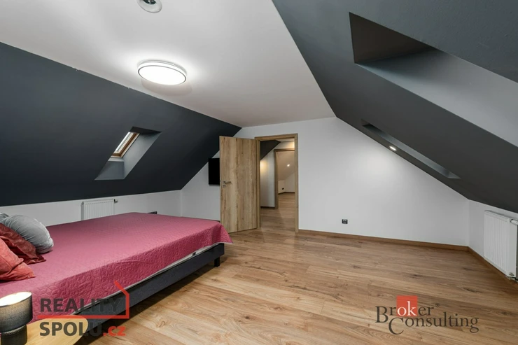 Po schodišti se dostanete do horního patra, kde vás přivítá prostorná chodba vedoucí do atypického pokoje ve tvaru U. Tento velkorysý prostor nabízí ideální využití jako obří dětský pokoj s hernou nebo reprezentativní pracovna. Další možné využití ponecháváme již na vás – zde se meze skutečně nekladou. Dále zde naleznete druhou koupelnu s vanou, umyvadlem a toaletou a také hlavní ložnici s dostatkem soukromí.