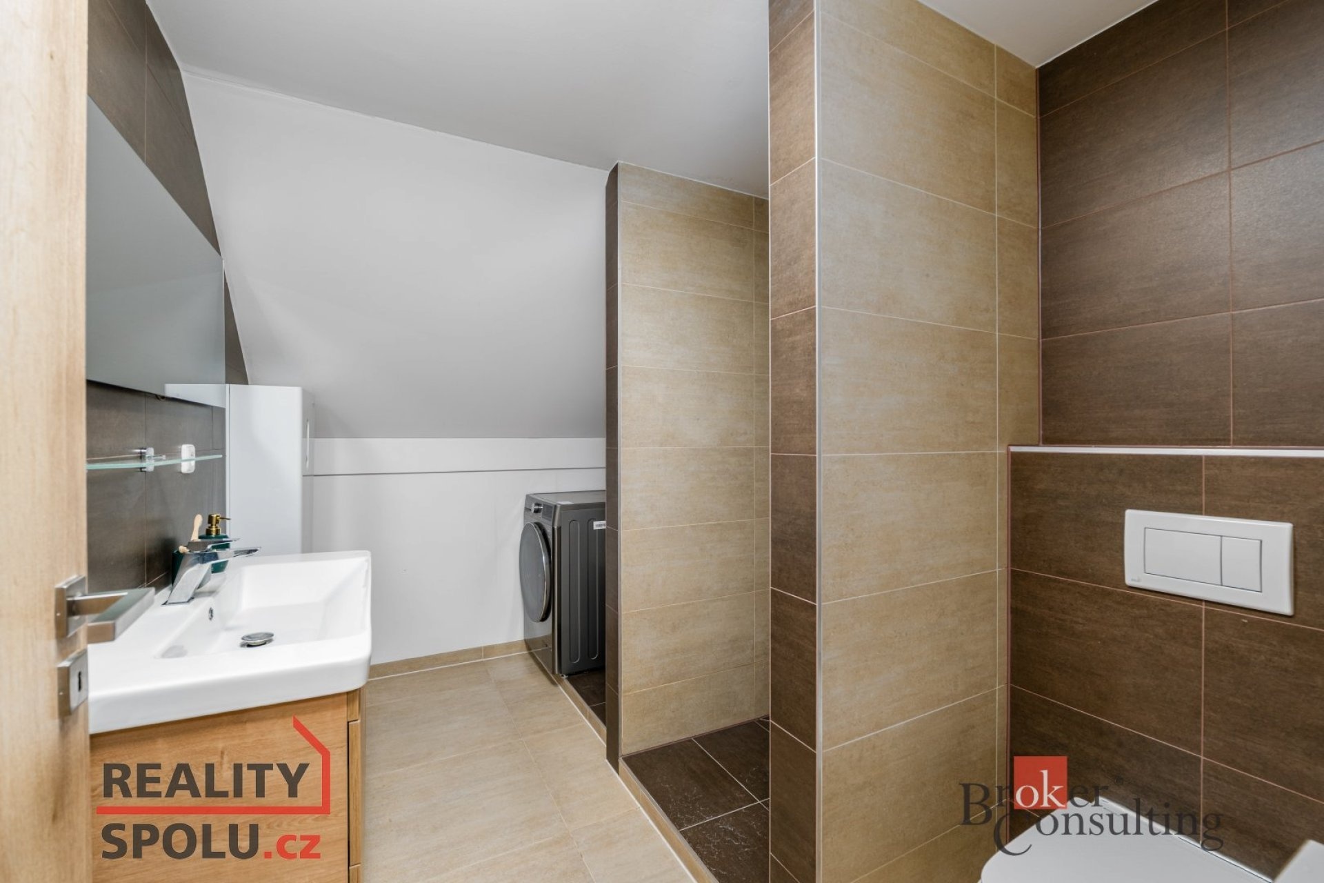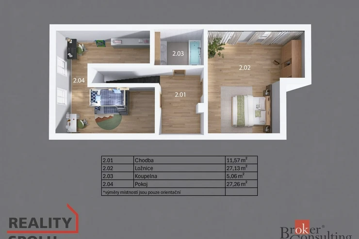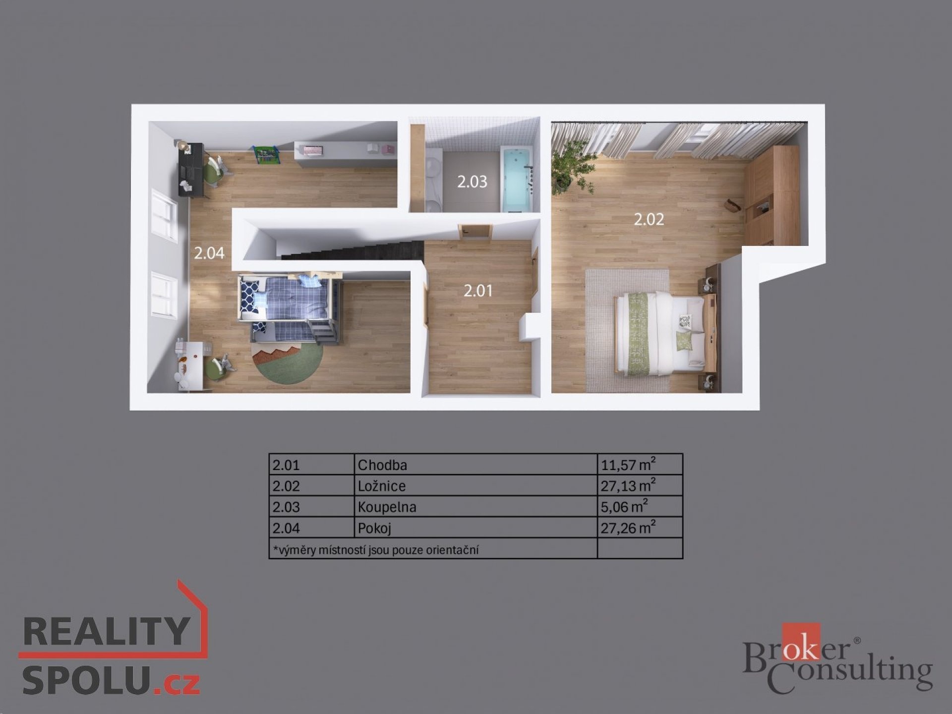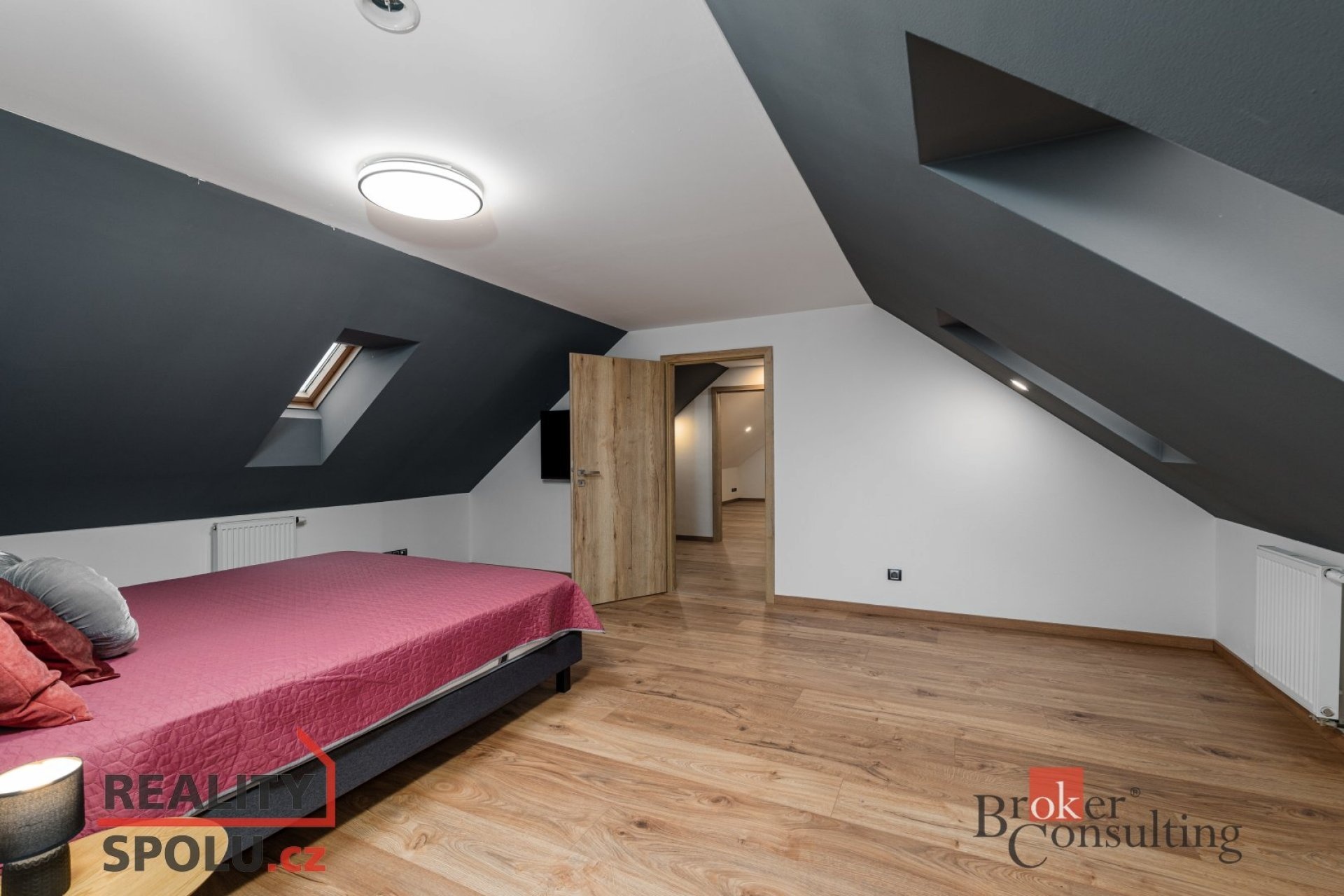 Po schodišti se dostanete do horního patra, kde vás přivítá prostorná chodba vedoucí do atypického pokoje ve tvaru U. Tento velkorysý prostor nabízí ideální využití jako obří dětský pokoj s hernou nebo reprezentativní pracovna. Další možné využití ponecháváme již na vás – zde se meze skutečně nekladou. Dále zde naleznete druhou koupelnu s vanou, umyvadlem a toaletou a také hlavní ložnici s dostatkem soukromí.