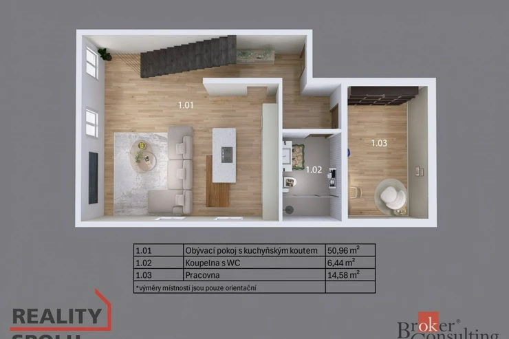 V dolním patře bytu se nachází koupelna se sprchovým koutem, toaletou a umyvadlem, samostatný pokoj aktuálně využívaný jako šatna a především dominantní obývací část s plně vybaveným kuchyňským koutem.