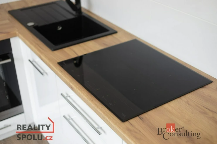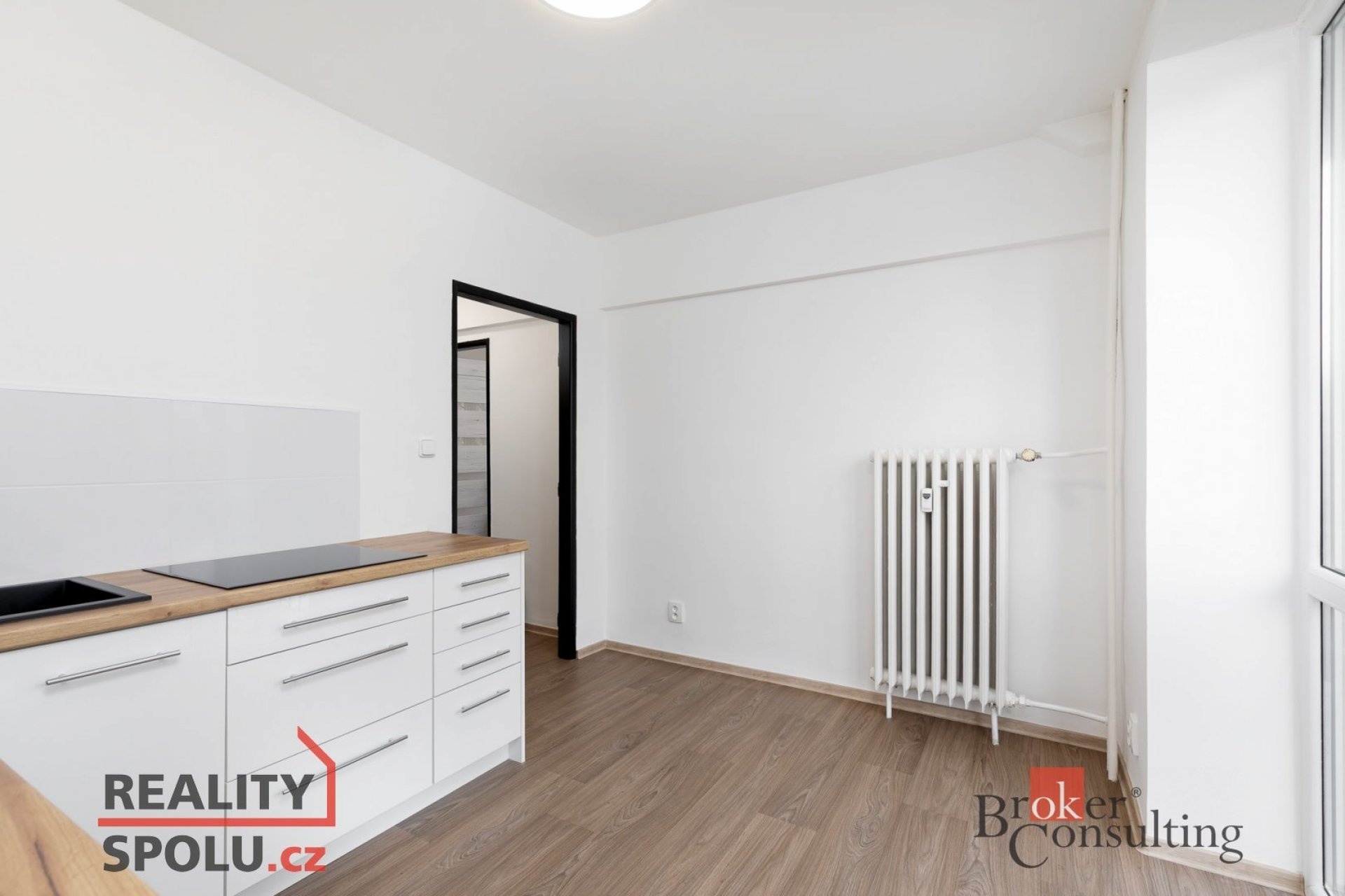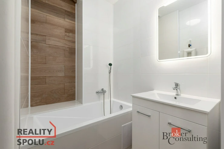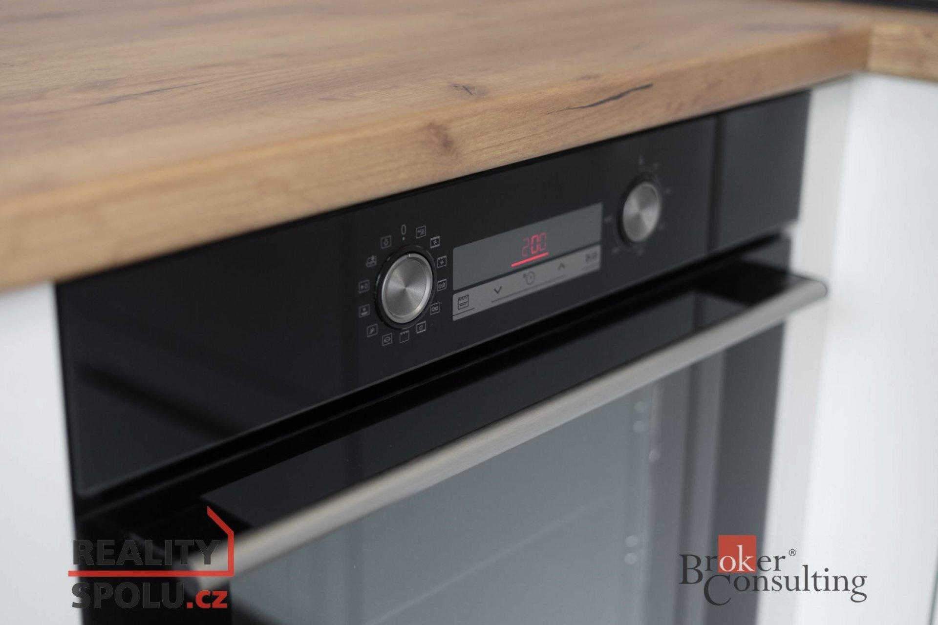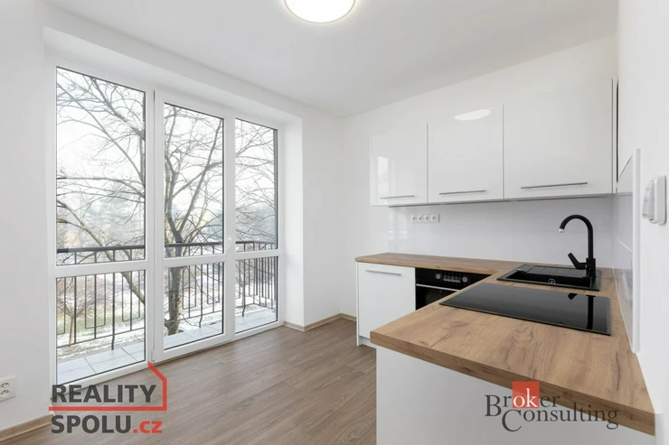 Samotný byt působí světlým a čistým dojmem. Interiér je po celkové rekonstrukci, má nové podlahy v dekoru dřeva, nové rozvody, osvětlení i interiérové dveře. Kuchyňská linka je nová, v moderním bílém provedení s pracovní deskou v dekoru dřeva, vybavená vestavnou troubou, indukční varnou deskou, myčkou a dřezem. Koupelna je řešena vanou, sanitou a podsvíceným LED zrcadlem, což prostoru dodává moderní a praktický charakter.