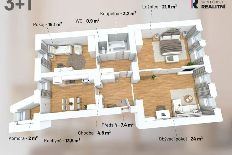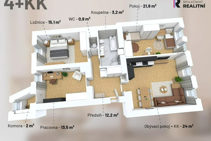 can be converted into a beautiful 4+kk, see the visualization and 3D plan. The