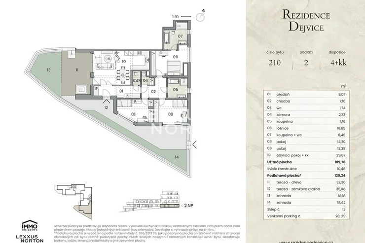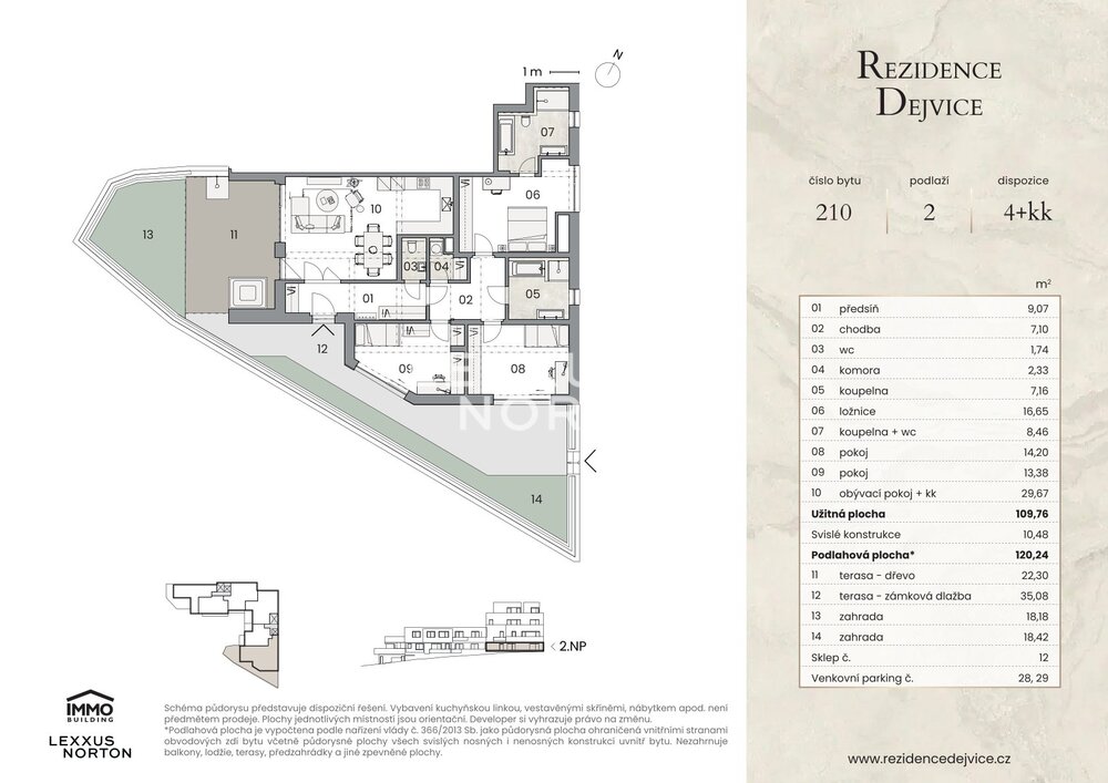 We are offering for sale a spacious three-bedroom apartment in the Rezidence Dejvice residential project, which stands out with its generous floor area of 120.24 sqm and exclusive terrace and private garden, thanks to which connection with the surrounding greenery is an everyday reality. The three-bedroom layout offers maximum comfort and plenty of space for families and individuals looking for exceptional living in a prestigious location.The apartment features a spacious living room with a kitchenette and direct access to the terrace, three separate bedrooms with ample storage space, two bathrooms (main and en-suite), a separate toilet, a dressing room, and a storage room. High ceilings and large windows not only provide plenty of daylight, but also a pleasant feeling of airiness and openness. Thanks to its well-thought-out design, the apartment is perfect for both family life and a comfortable home office.The above-standard design of the apartment includes aluminum windows with insulated triple glazing and electrically controlled blinds, oak parquet flooring in the living areas, ceiling heating and cooling controlled via a mobile app, and central heat recovery for a healthy indoor climate. The bathrooms feature premium sanitary ware and large-format ceramics from Villeroy & Boch and Hansgrohe. The apartment is equipped with smart home technology and can be customized according to the client's wishes. Selected units also offer the option of installing a whirlpool, outdoor shower, and night lighting.Practical accessories include a cellar and two garage parking spaces. Direct access to a terrace facing a quiet courtyard guarantees pleasant privacy and contact with urban greenery.Rezidence Dejvice is located at a prestigious address on the border of Orechovka and Dejvice, in the vicinity of embassies, villas, and landscaped parks (Hadovka and Stromovka nature parks). The surrounding area offers complete civic amenities, including renowned schools, shops, restaurants, and sports facilities. Excellent transport accessibility – the Borislavka metro station is only a few minutes' walk away, and the center of Prague and Vaclav Havel Airport are quickly accessible by car and public transport.The project meets the most energy-efficient standards (PENB: A).Experience everyday comfort in the heart of a prestigious neighborhood. We will be happy to provide you with detailed information!