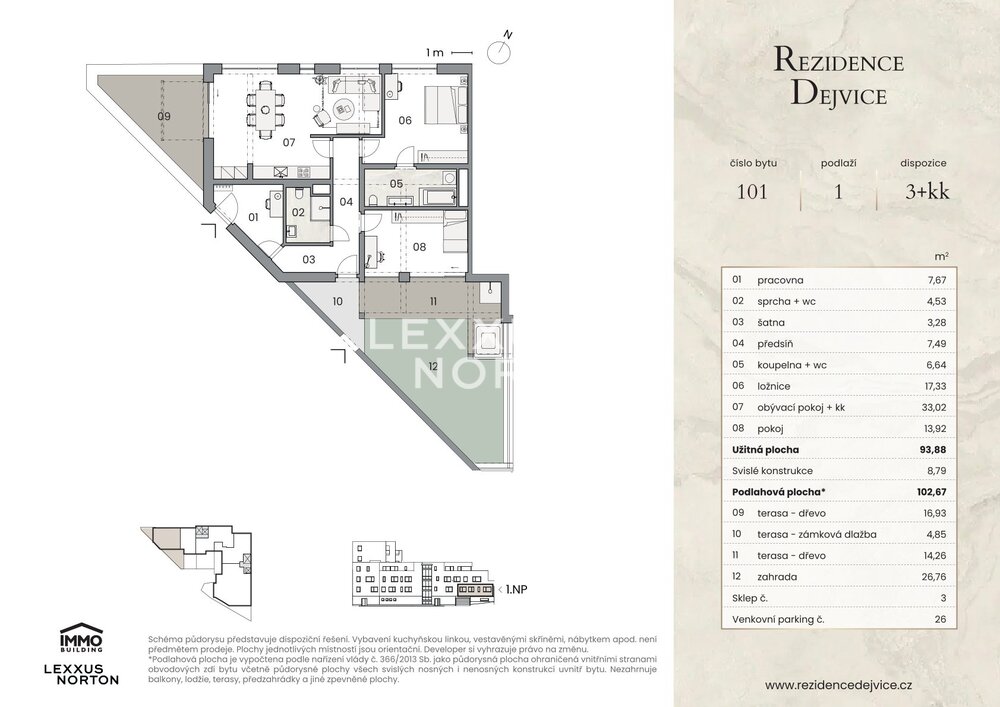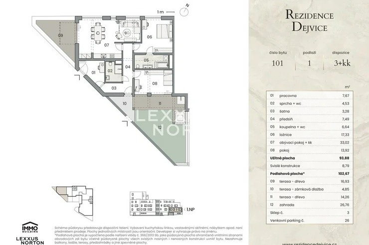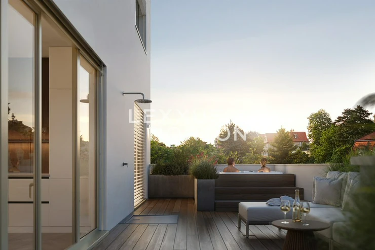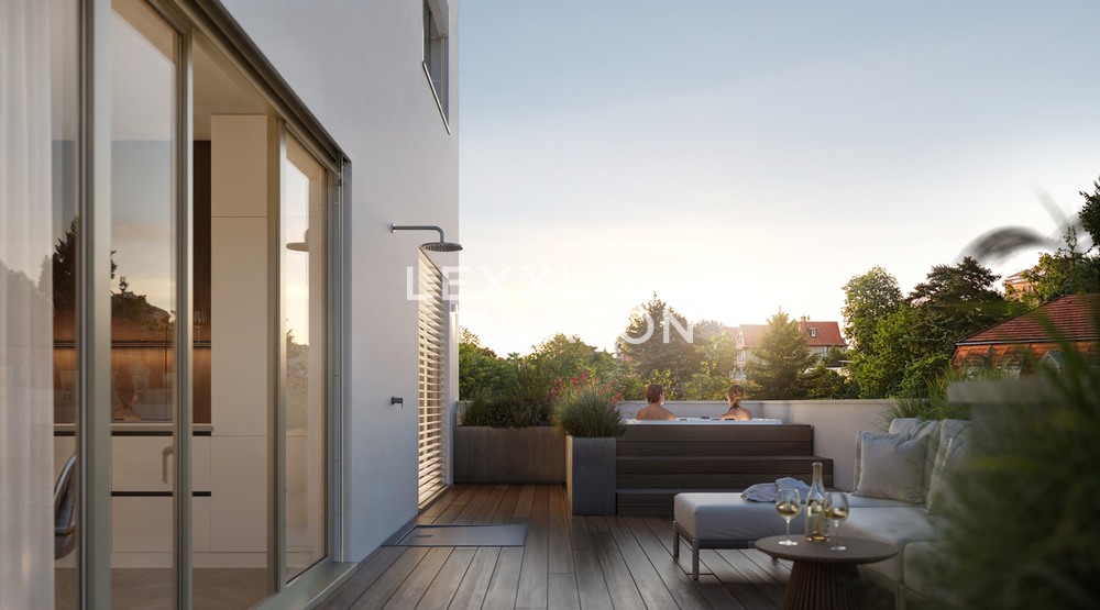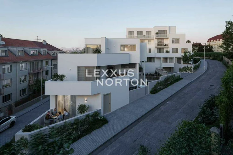 We are offering for sale an exclusive two-bedroom apartment in the modern Rezidence Dejvice project, which combines timeless design, high-quality furnishings, and an exceptional location in one of the most sought-after parts of Prague. The apartment has a usable area of 93.88 sqm and its main feature is a spacious living room with a kitchenette and access to a terrace with an area of 38 sqm and its own garden with an area of 26.76 sqm.The layout of the apartment also offers two quiet and separate rooms and a practical storage room. The entrance hall provides plenty of storage space, while the modern bathroom with above-standard sanitary ware and large-format tiles, together with a separate toilet, brings the highest level of comfort to everyday living.The entire apartment is designed with an emphasis on detail and comfort. Aluminum windows with insulated triple glazing are equipped with electrically controlled external blinds, ensuring peace, privacy, and an optimal indoor climate throughout the year. The living areas feature oak parquet flooring, which enhances the elegant and warm atmosphere of the home. Ceiling heating and cooling can be conveniently controlled via a mobile app. Air quality is ensured by centralized heat recovery, which provides fresh air throughout the apartment.Other premium features include bathroom ceramics and fittings from Villeroy & Boch and Hansgrohe and smart home technology, which will allow the future owner to easily install a Smart Home solution according to their own preferences. The unit is also prepared for the installation of a whirlpool, outdoor shower, awning, and sauna. The entrance door to the apartment meets security class 3, ensuring maximum safety and peace of mind.The apartment comes with a cellar and one garage parking space in the basement of the building. All apartments are designed to provide maximum privacy and contact with the surrounding greenery.The Dejvice Residence is located at a prestigious address on the border of Orechovka and Dejvice, in the vicinity of embassies, villas, and landscaped parks (Sarka, Hadovka, and Stromovka nature parks). Complete civic amenities are available in the immediate vicinity, including renowned schools, shops, restaurants, and sports facilities. Excellent transport links – the Borislavka metro station is just a few minutes' walk away, and the center of Prague and Vaclav Havel Airport are easily accessible by car and public transport.The project meets the most energy-efficient standards (PENB: A).If you are interested in an appointment or more detailed information, please do not hesitate to contact us.