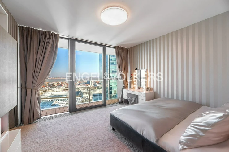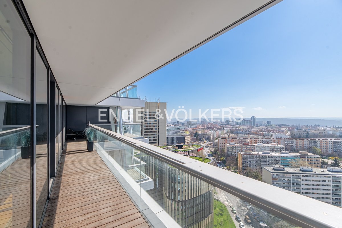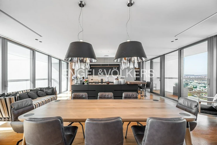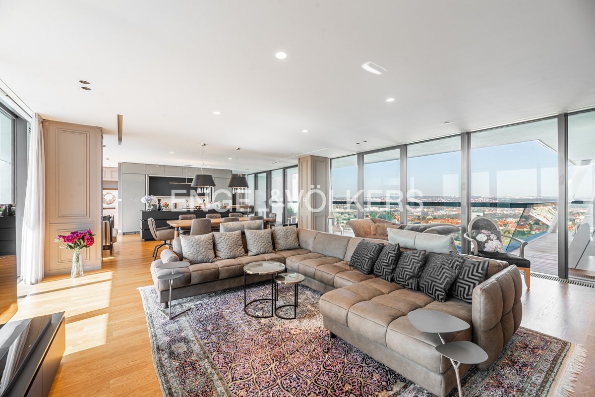 We present an exceptional apartment in the iconic luxury V Tower residence from 2018, which, thanks to the original architectural design by Radan Hubička's studio, has become the most famous high-rise building in Prague, winning a number of prestigious architectural awards. The apartment is located in the upper part of the building, on the 18th floor, and offers unique views of the Prague skyline, Prague Castle, Vyšehrad, and the historic city centre.