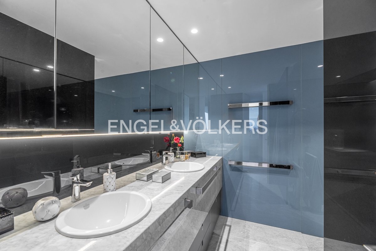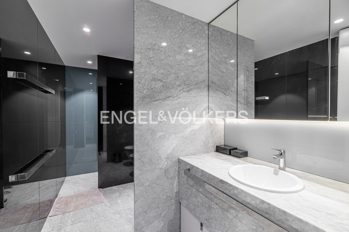 The master bedroom has its own walk-in closet and en-suite bathroom with a bathtub and shower, while the other two bedrooms share a bathroom with a shower. The apartment also includes a separate walk-in closet, utility room, and separate toilet. The interior is fully equipped to a high standard, including oak floors, Bianco Carrara stone tiles, aluminium windows with triple glazing and electric blinds, Jaga underfloor heating, Clina ceiling cooling, and an Atrea heat recovery system. The bathrooms are fitted with Hansgrohe, Kaldewei, and Villeroy & Boch fixtures.