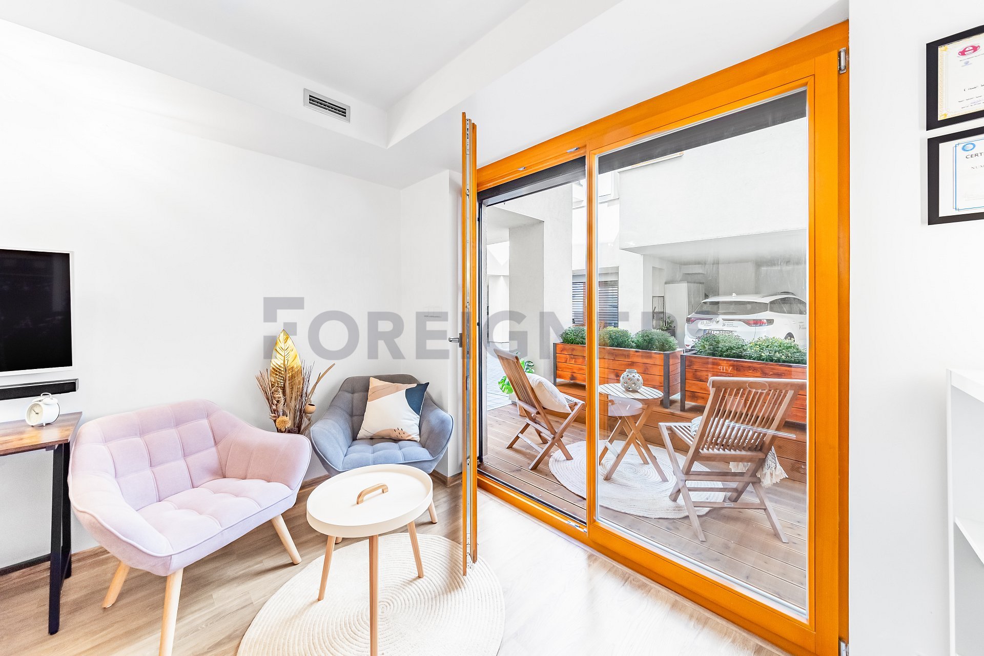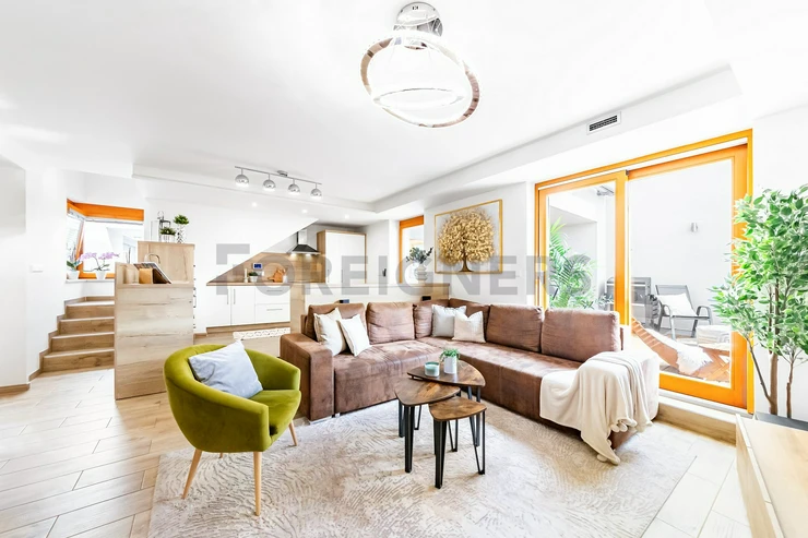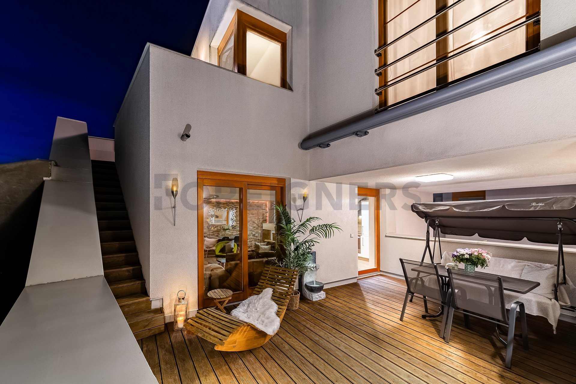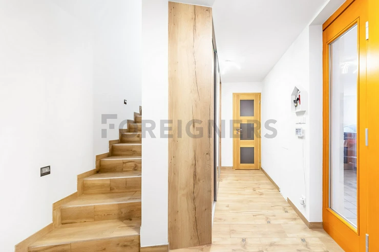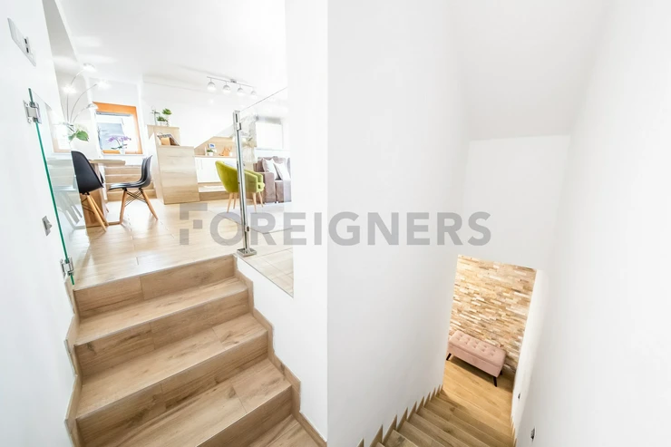 The apartment has the character of a terraced house. However, the property has been officially approved as two residential units. Upon entering the house, you are welcomed by a spacious hallway with a built-in wardrobe, providing ample storage space. The ground floor offers a cozy study with a bright French window and access to one of the terraces. There is also a bathroom and a utility room.