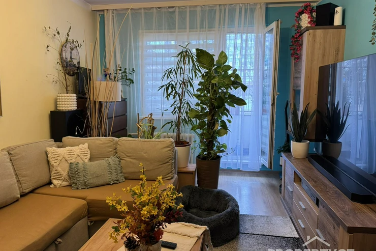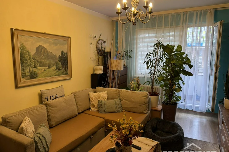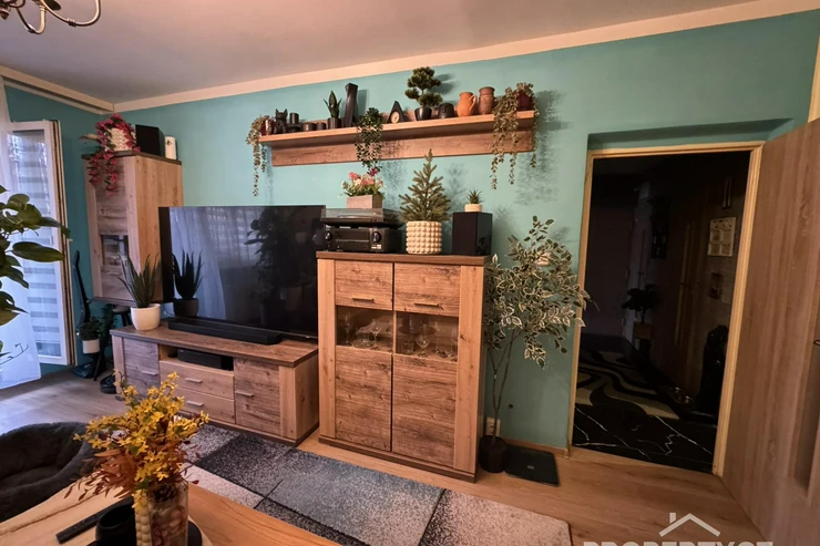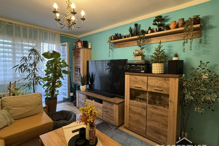 Jednotku tvoří 3 samostané pokoje, a to obývací pokoj s balkónem, 2 ložnice, dále kuchyňský kout a prostorná předsíň s oddělenou koupelnou a WC.