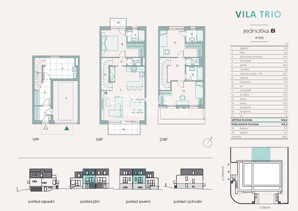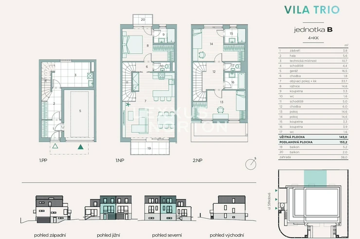 The new project Vila Trio Strasnice presents truly exceptional terraced townhouses, whose architecture and layout feature elements of the English townhouse style. This is no ordinary project – each house is unique and will appeal to even the most demanding clients looking for distinctive, above-standard, and prestigious living for their families. We offer an exceptionally 3-bedroom family house with area of 153.2 sqm, a private garden, and a garage for one car. The concept of the house was designed to meet the high demands of modern urban life while providing the peace and comfort of family living.The layout of the house consists of three floors – the ground floor, the main living floor, and the upper floor. On the ground floor, you will find an entrance hall, a utility room, and a spacious garage. The main living floor offers a generous living area with a kitchenette and access to two balconies, which naturally extend the living area of the house. There is also a separate toilet and a master bedroom with its own bathroom and dressing room. The upper floor consists of two bright rooms suitable as children's rooms, a study, or guest rooms. There is also a cozy modern bathroom. The entire floor plan provides plenty of space for spending time together, but also privacy and space to relax.The standards of the house are exceptionally high and correspond to premium living. The entire interior is illuminated by large-format aluminum windows with insulated triple glazing and top-quality thermal and acoustic insulation. The floors in the living areas are made of three-layer oak wood with a brushed oiled surface, while the bathrooms and hallways feature large-format Italian Refin tiles and Villeroy & Boch sanitary ware. Interior doors have concealed door frames and magnetic locks. Security entrance doors comply with class 3. Windows are ready for the installation of external aluminum blinds to increase comfort and regulate light. The house is heated by an air-to-water heat pump in combination with hot water underfloor heating, which is supplemented by a recuperation unit for healthy and economical ventilation. The house is also ready for the installation of photovoltaics and has air conditioning in the main rooms.The project is located in a sought-after and easily accessible part of Strasnice, just a few minutes' walk from metro line A (Skalka/Strasnicka) and tram lines, which will take you to the center of Prague in 15 minutes. The location also offers quick access to the South Connecting Road and the City Ring Road. Strasnice has long been one of the most pleasant districts in Prague, offering a full range of amenities, including schools, high schools, a health center, shops, and a wide variety of restaurants. The popular Gutovka and Malesicky park are also nearby.The project is backed by an experienced developer with a rich portfolio of successful residential buildings, which guarantees high quality, thoughtful design, and long-term reliability.