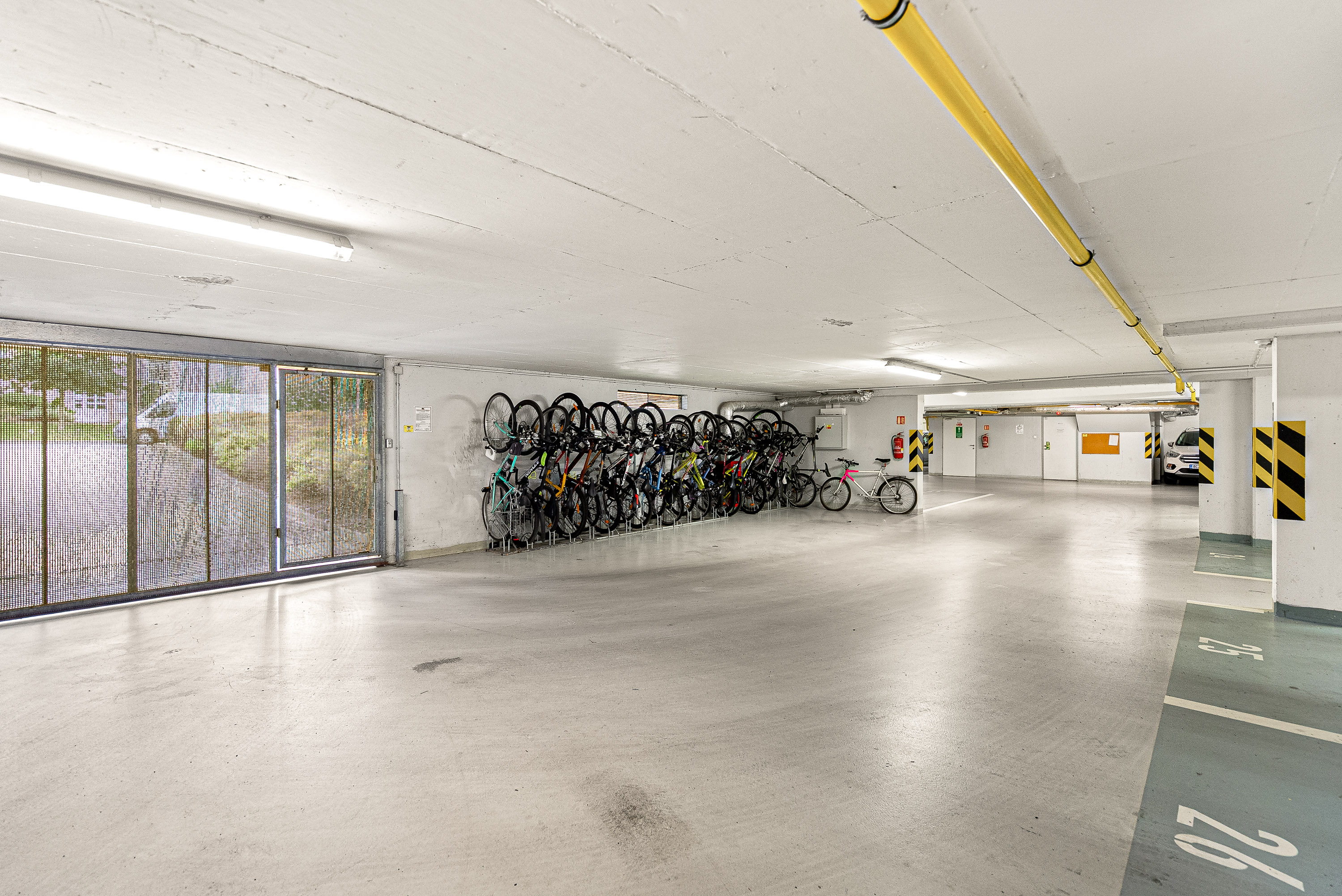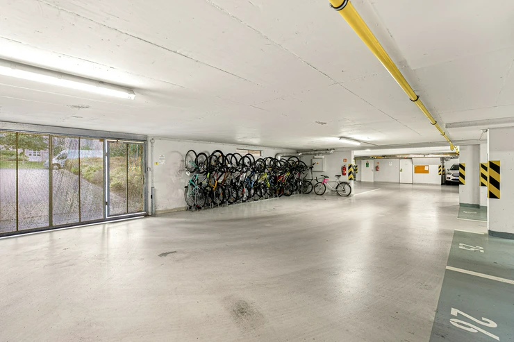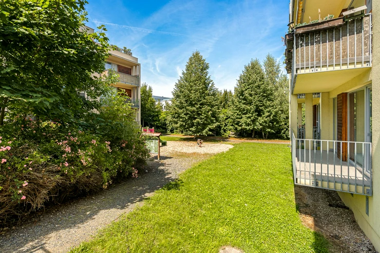 The balcony facing the quiet courtyard provides a pleasant place to relax. Parking is available on the street without any issues. Nearby amenities include a swimming pool, sports facilities, and plenty of greenery.