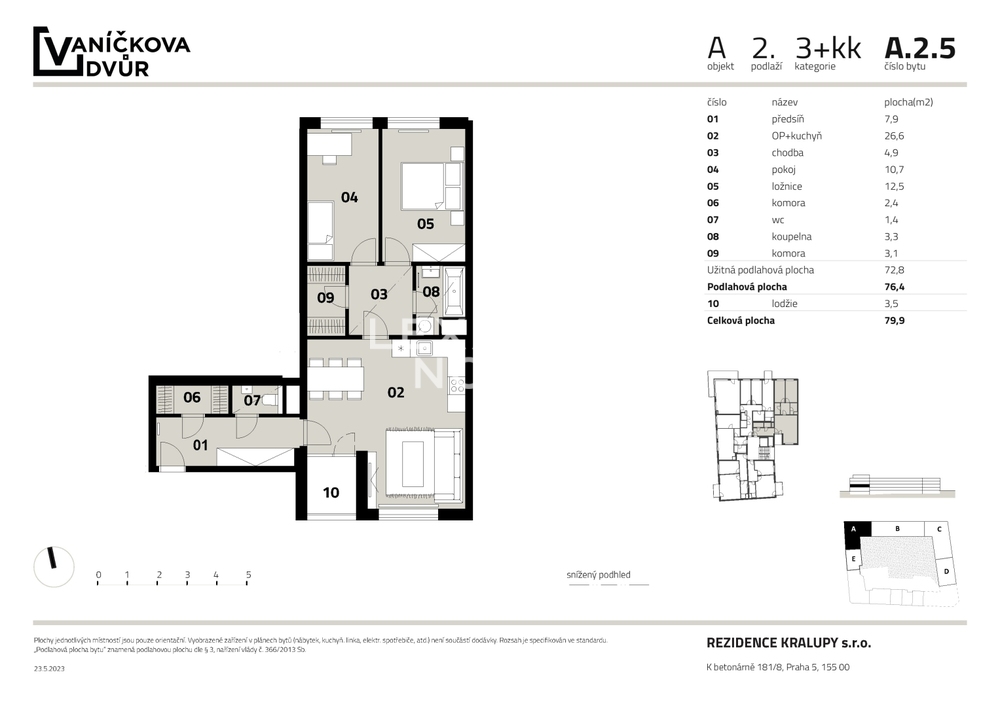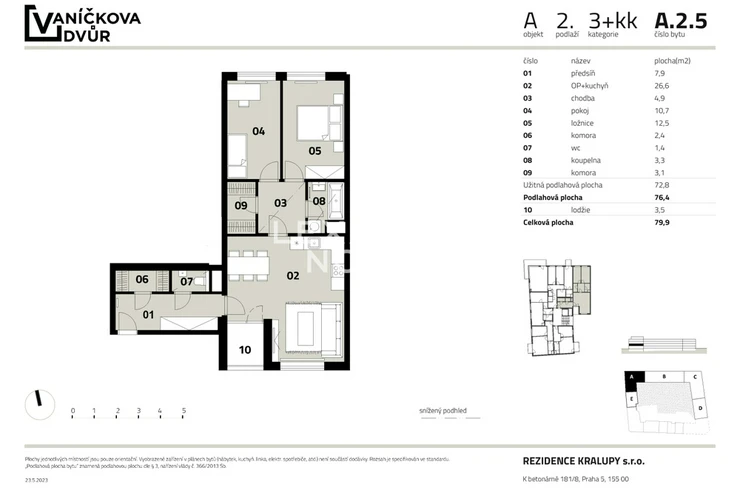 The modern Vanickova Dvur project offers you a generously designed two-bedroom apartment with a floor area of 76.4 sqm and a 3.5 sqm loggia. The apartment is located on the second floor of the newly built Vanickova Dvur project in the heart of Kralupy nad Vltavou.In the very centre of Kralupy nad Vltavou, a unique project of six apartment buildings is being built, which combines the uniqueness of modern living and a pleasant environment in a well-equipped and lively city. Vanickova Dvur will offer 100 new apartment units from studio apartment to three bedroom apartment with a choice of balconies or front gardens and unique duplexes. The project also includes garage parking spaces and a private courtyard full of greenery with a children's playground. To enrich the site and provide additional benefits, the project itself is equipped with a total of 13 commercial spaces for future services. The project will offer the premium standard that is currently expected, providing the perfect backdrop for a pleasant life and its future owners.The interiors of the apartments at Vanickova Dvur stand out for their timeless elegance and emphasis on quality. Laminate flooring in the living areas is complemented by ceramic tiles in the bathrooms and hallways, while triple-glazed windows ensure quiet and thermal comfort. The bathrooms are designed in a modern style with a bathtub or spacious shower. The architects also paid attention to the common areas – subtle materials, a green courtyard, and thoughtful details create a harmonious environment that naturally blends in with the surrounding buildings.Kralupy nad Vltavou is located north of Prague between Melnik and Slany.Due to its strategic location it is a truly unique and versatile project. The location has everything a future owner could wish for, all civic amenities, cultural amenities, nearby nature, sports and relaxation.If you prefer natural beauty, you can go to the rocky hill Hostibejk with a viewing arbour.Another option is to take a trip along the Vltava River along the so-called Dvorak Trail, which connects Kralupy nad Vltavou with Nelahozeves and leads to the local castle.The project is located in the centre, but also in the direct vicinity of the train and bus station with regular connections to Prague, which can be reached comfortably in 30 minutes.There is also a nearby direct connection to the D8 motorway.