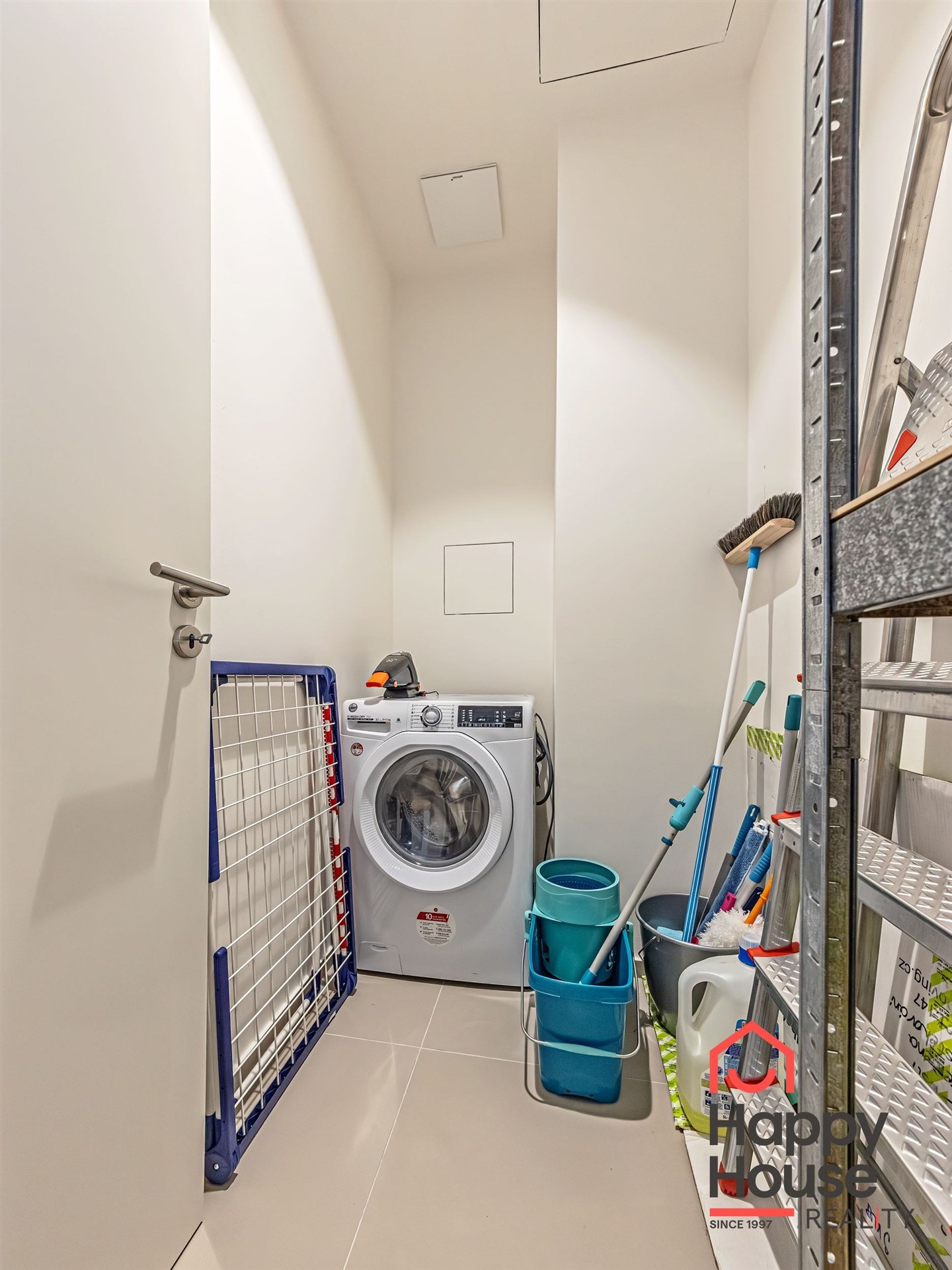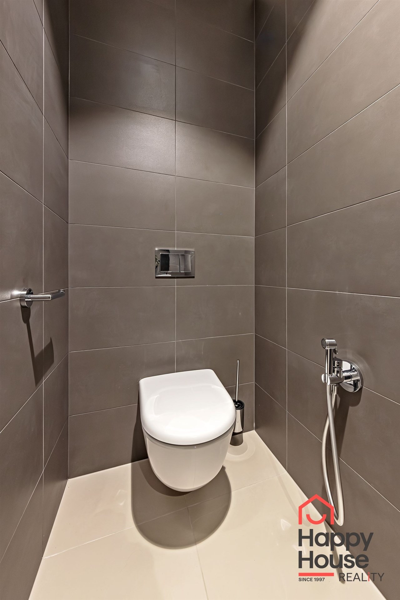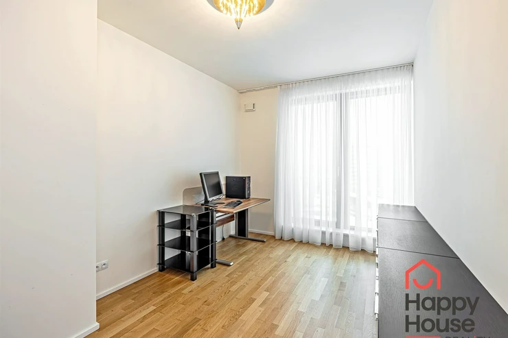 One of the rooms is furnished as a study, another as a bedroom with an ensuite bathroom, and the last one as a guest room. The apartment has a total of 2 bathrooms, 3 toilets, and a bidet. The bathrooms are equipped with Laufen brand sanitary ware. There is also a practical utility room on the hallway for placing a washing machine and dryer.