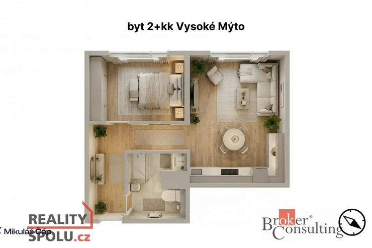 Dispozice je řešena velmi efektivně: samostatná ložnice, obývací pokoj s kuchyňským koutem a koupelna.