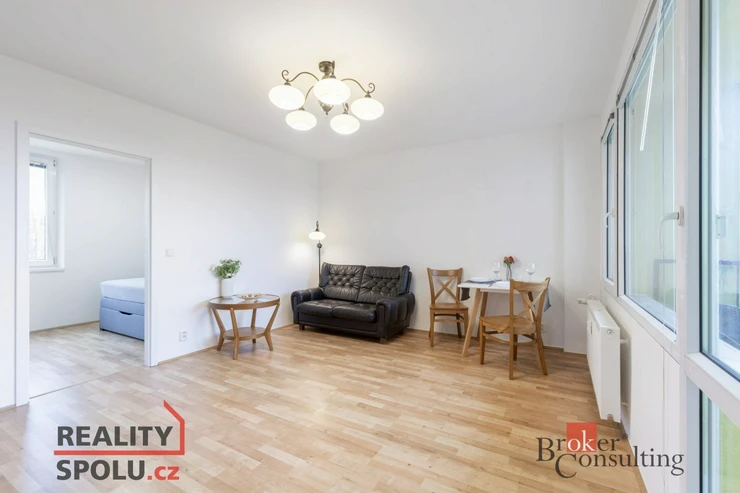 Obývací pokoj je propojen se vstupem na prostornou lodžii s příjemným výhledem do zeleně – ideální místo pro ranní kávu i večerní odpočinek.