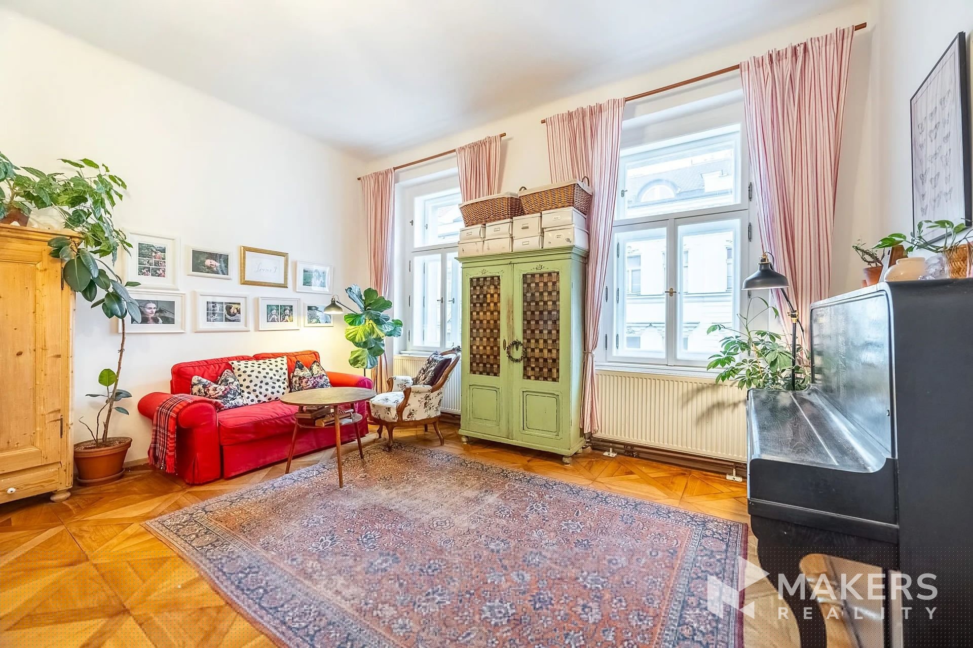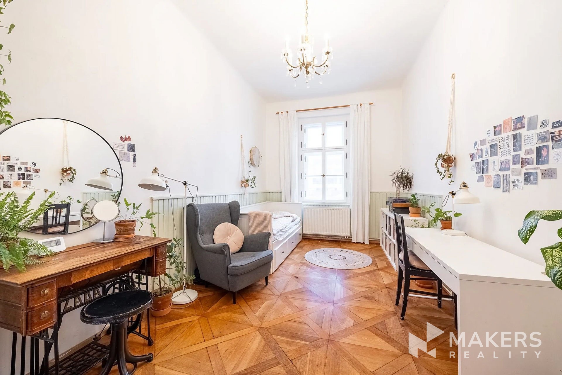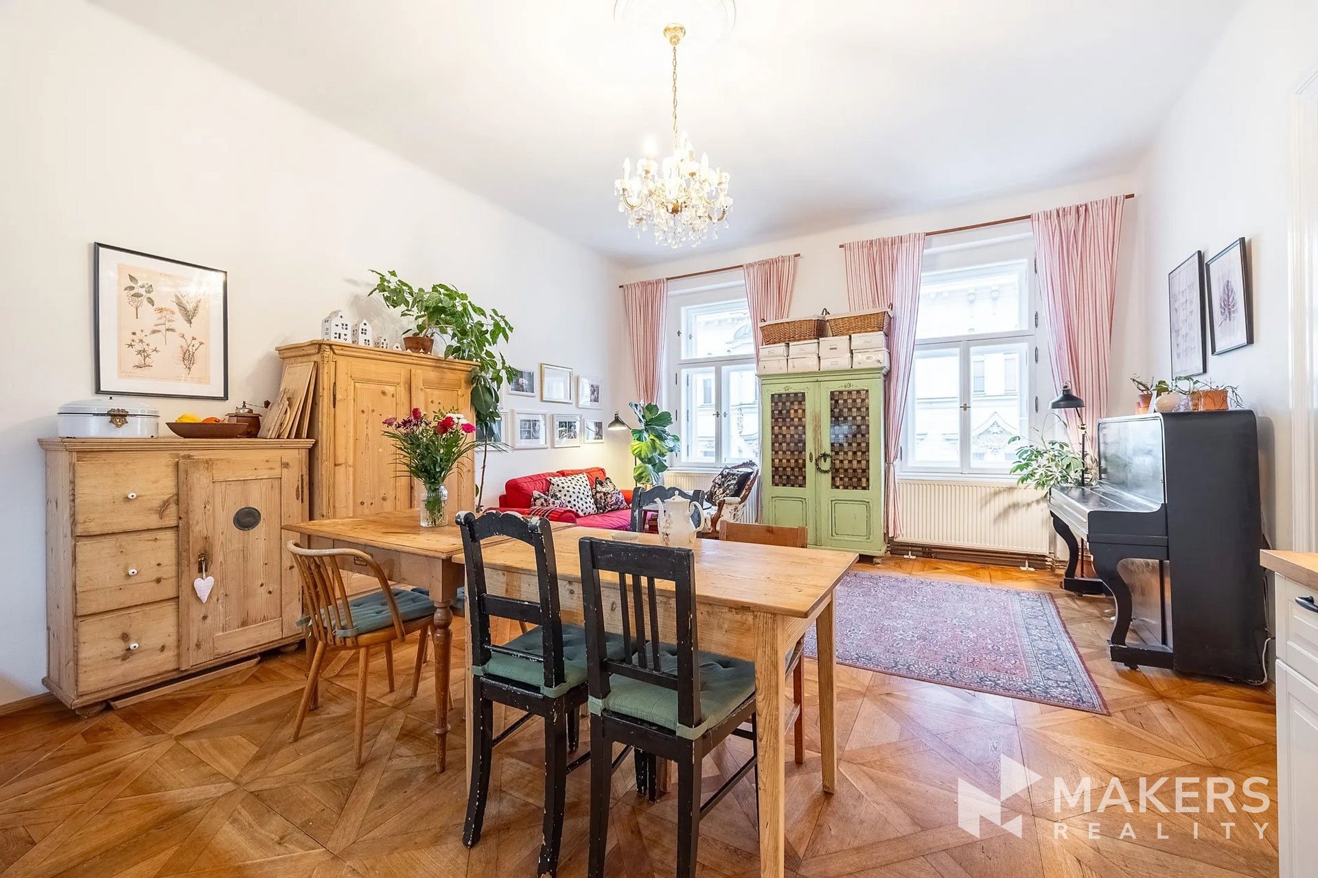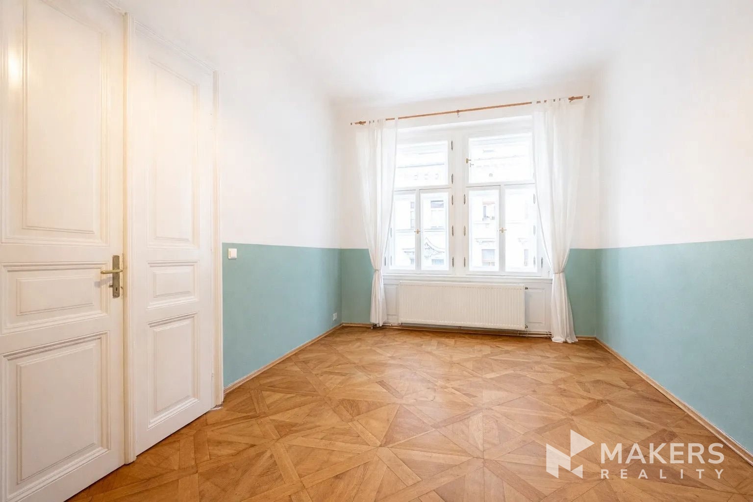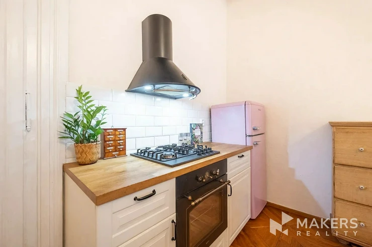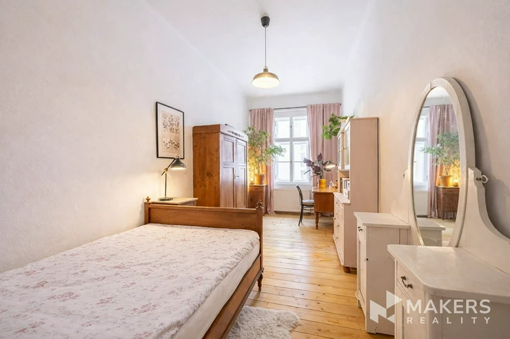 The layout includes a spacious living room with a kitchenette and three separate non-adjoining bedrooms, providing maximum privacy and comfort for family living. Thanks to the southeast and northwest orientation, the apartment is very bright yet quiet – the living area overlooks historic buildings in a heritage conservation area, while the bedrooms face a peaceful interior courtyard. The interior has preserved original details such as high ceilings, double doors, brass handles, and oak parquet flooring. A special highlight is the functional fireplace, which emphasizes the authentic atmosphere of the apartment.