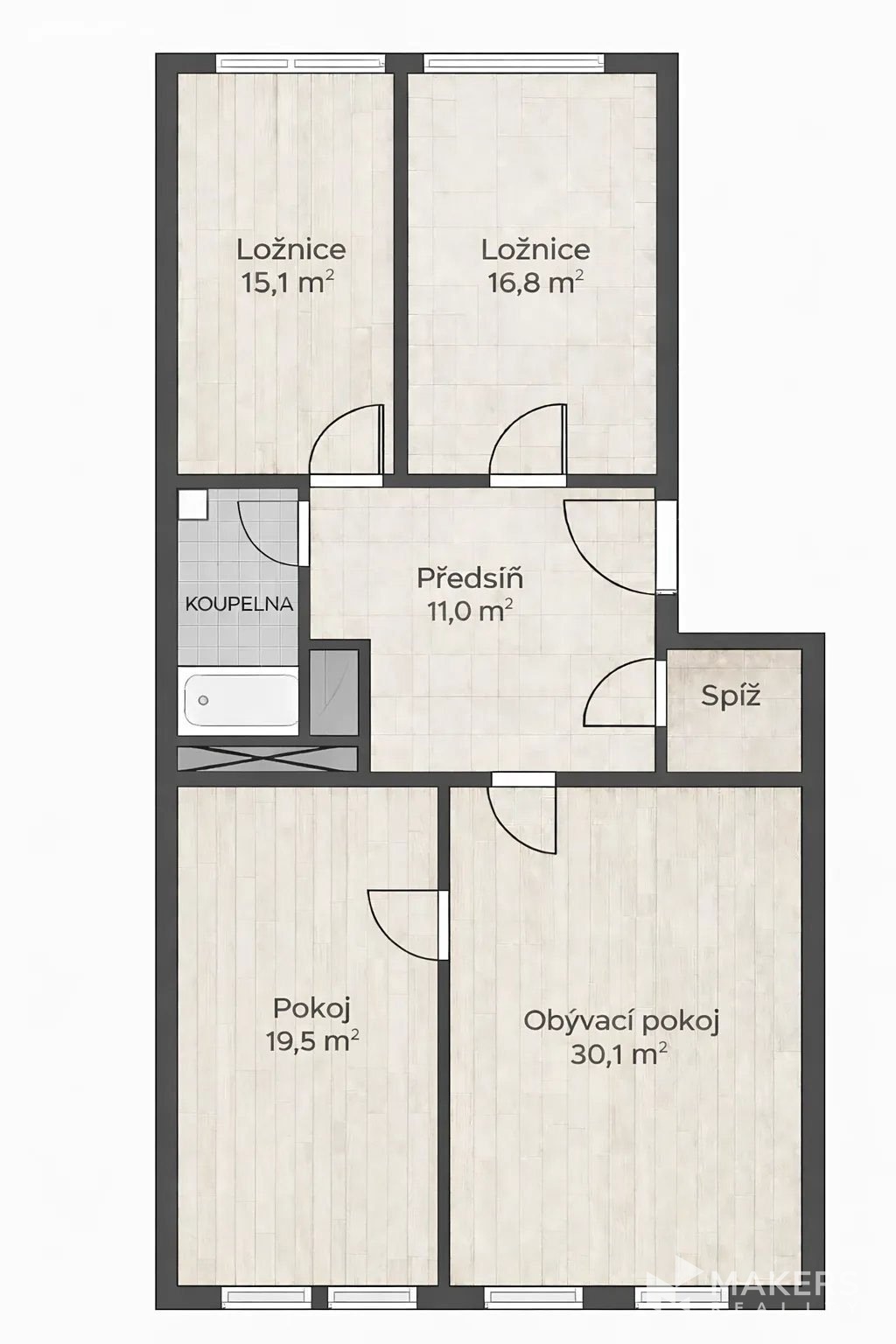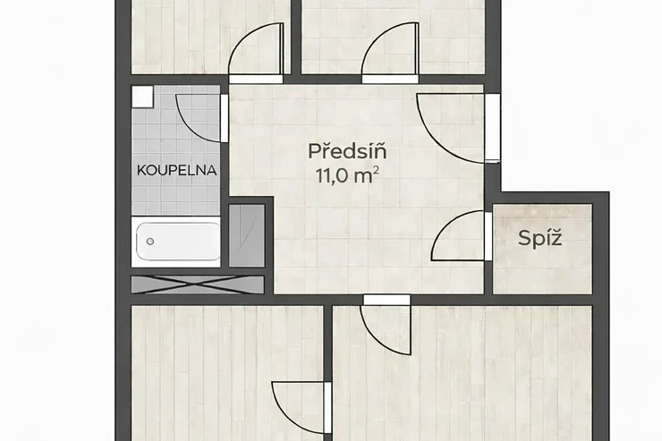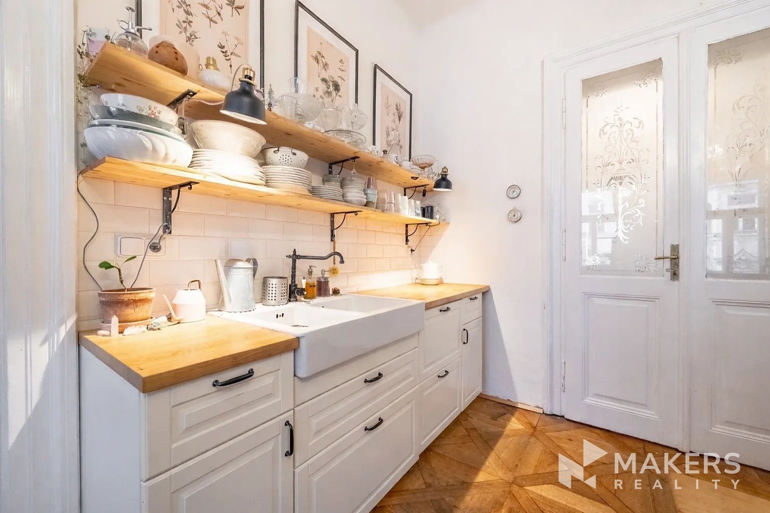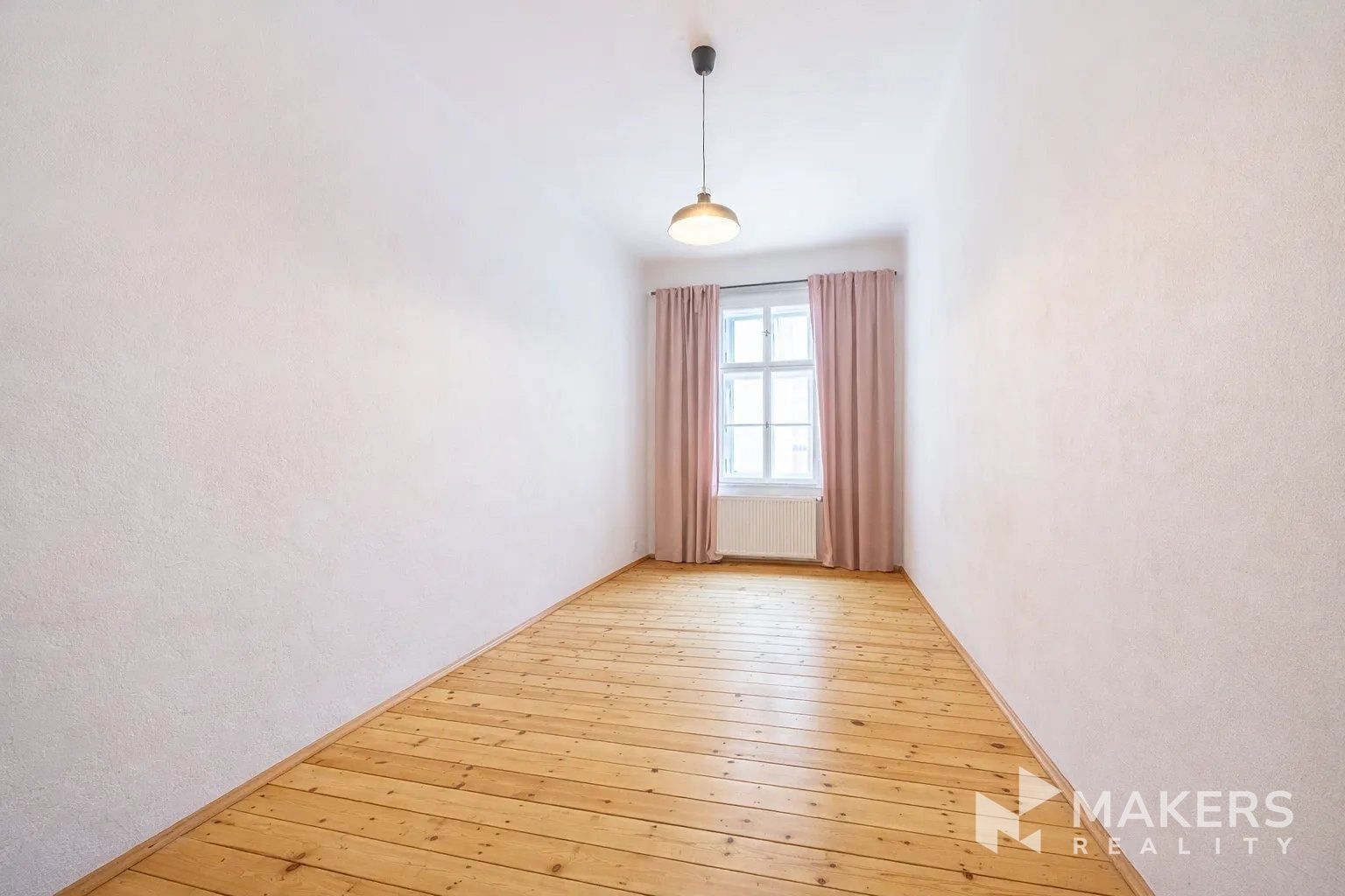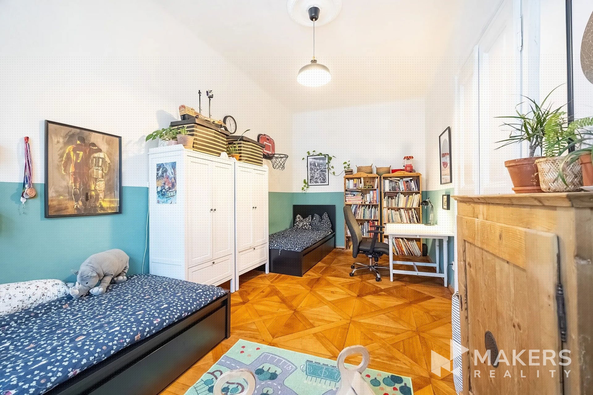 The layout includes a spacious living room with a kitchenette and three separate non-adjoining bedrooms, providing maximum privacy and comfort for family living. Thanks to the southeast and northwest orientation, the apartment is very bright yet quiet – the living area overlooks historic buildings in a heritage conservation area, while the bedrooms face a peaceful interior courtyard. The interior has preserved original details such as high ceilings, double doors, brass handles, and oak parquet flooring. A special highlight is the functional fireplace, which emphasizes the authentic atmosphere of the apartment.