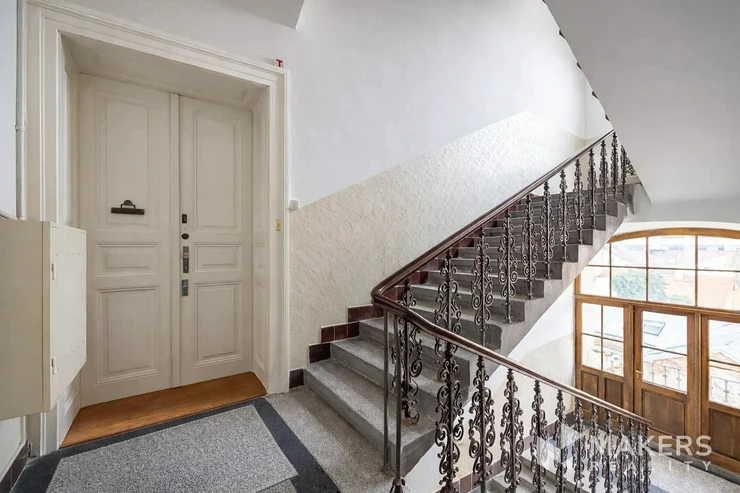 We offer for sale an exceptional spacious 4+kk apartment with a total area of 110 m², located on the 3rd floor of a historic building on a quiet cul-de-sac in one of Prague's most sought-after neighborhoods – Karlín. The apartment has preserved its authentic character with high ceilings, deep-set windows, and a working fireplace, while having undergone a sensitive renovation that retained all original historic features.