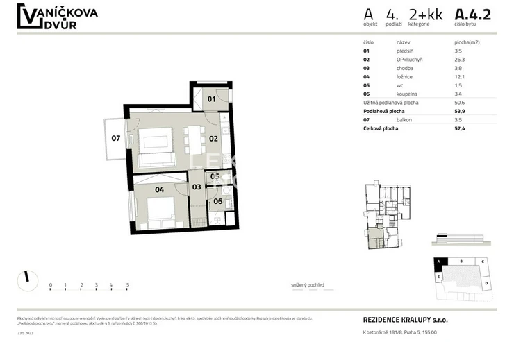 The modern project Vanickova Dvur offers for sale a generous one-bedroom apartment of 53.9 sqm with balcony of 3.5 sqm. The apartment is located on the 4th floor in the newly built project Vanickova Dvur in the heart of Kralupy nad Vltavou. In the very centre of Kralupy nad Vltavou, a unique project of six apartment buildings is being built, which combines the uniqueness of modern living and a pleasant environment in a well-equipped and lively city. Vanickova Dvur will offer 100 new apartment units from studio apartment to three bedroom apartment with a choice of balconies or front gardens and unique duplexes. The project also includes garage parking spaces and a private courtyard full of greenery with a children's playground. To enrich the site and provide additional benefits, the project itself is equipped with a total of 13 commercial spaces for future services. The project will offer the premium standard that is currently expected, providing the perfect backdrop for a pleasant life and its future owners.The interiors of the apartments at Vanickova Dvur stand out for their timeless elegance and emphasis on quality. Laminate flooring in the living areas is complemented by ceramic tiles in the bathrooms and hallways, while triple-glazed windows ensure quiet and thermal comfort. The bathrooms are designed in a modern style with a bathtub or spacious shower. The architects also paid attention to the common areas – subtle materials, a green courtyard, and thoughtful details create a harmonious environment that naturally blends in with the surrounding buildings.Kralupy nad Vltavou is located north of Prague between Melnik and Slany. Due to its strategic location it is a truly unique and versatile project. The location has everything a future owner could wish for, all civic amenities, cultural amenities, nearby nature, sports and relaxation.If you prefer natural beauty, you can go to the rocky hill Hostibejk with a viewing arbour.Another option is to take a trip along the Vltava River along the so-called Dvorak Trail, which connects Kralupy nad Vltavou with Nelahozeves and leads to the local castle.The project is located in the centre, but also in the direct vicinity of the train and bus station with regular connections to Prague, which can be reached comfortably in 30 minutes.There is also a nearby direct connection to the D8 motorway.
