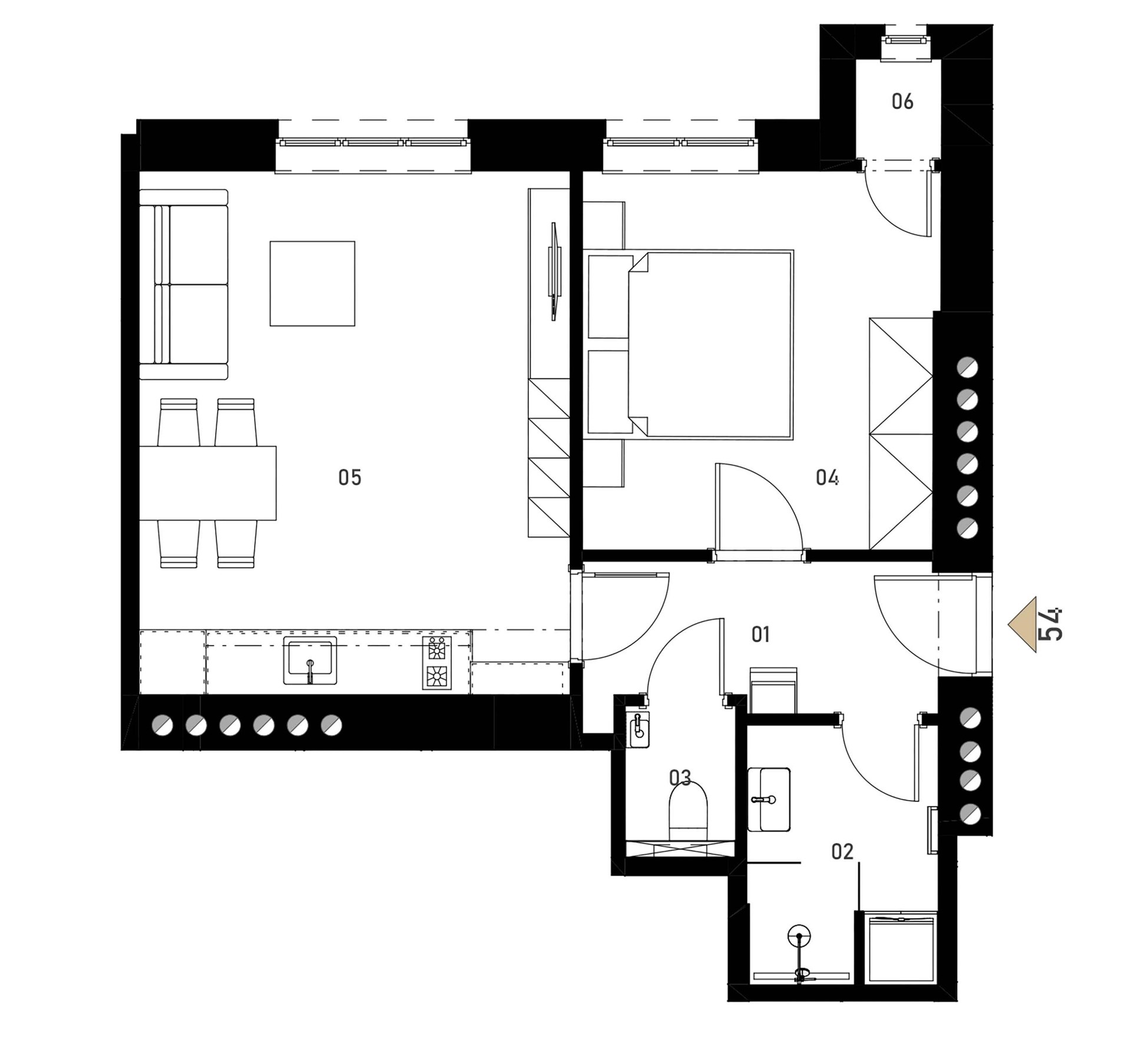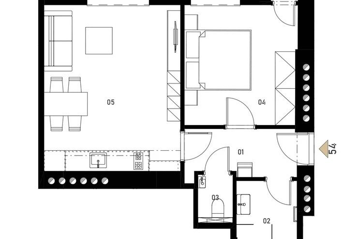 The apartment with a floor area of 45.6 m², is located on the 1st floor and includes a living room with preparation for a kitchen; a bedroom, an entrance hall, a practical storage room, a bathroom with a shower, and a separate WC. The unit also includes a cellar space. The apartment will be finished in a fit-out design - including a finished bathroom, floors, doors, and complete wiring. All equipment meets current standards of modern living.