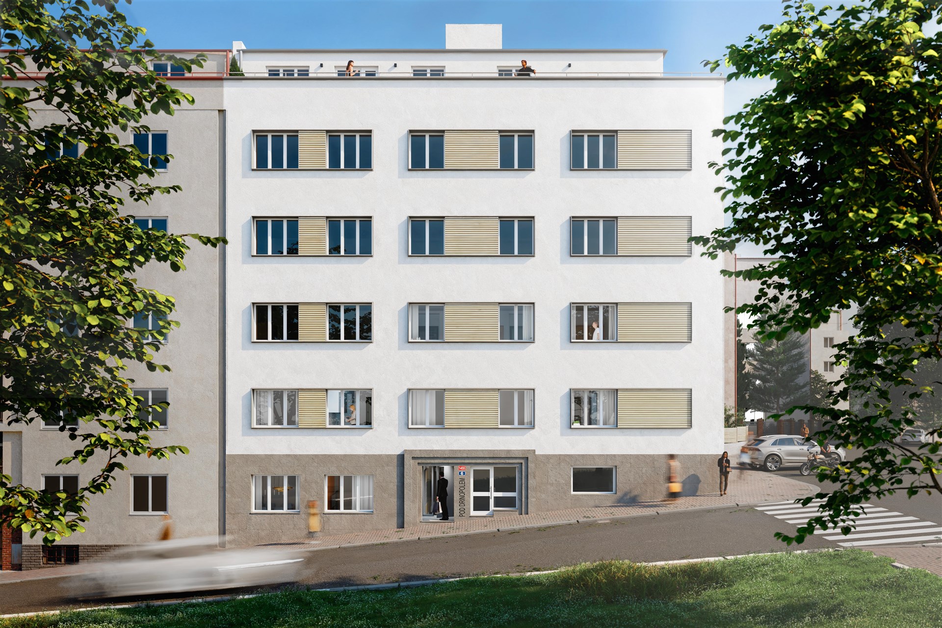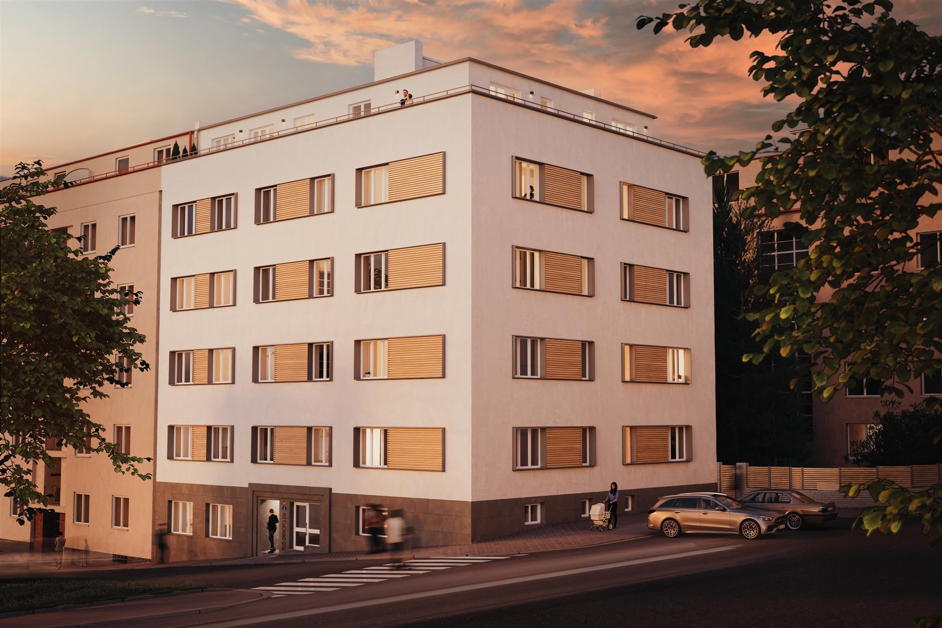 The building is undergoing a complete renovation, which includes a new elevator, entrance portals with security doors, and stylish common areas with ceramic tiles and wooden elements. Residents will have access to a wellness area with a sauna and a gym, a bicycle storage room, a laundry room, and a landscaped courtyard with seating – perfect for a little rest and relaxation. The residence is located on Pod Drinopolem, a quiet street surrounded by trees and residential buildings. All civic amenities including shops, cafes, schools and public transport stops are within walking distance. The location offers a calm environment with quick connections to the city center and the airport.