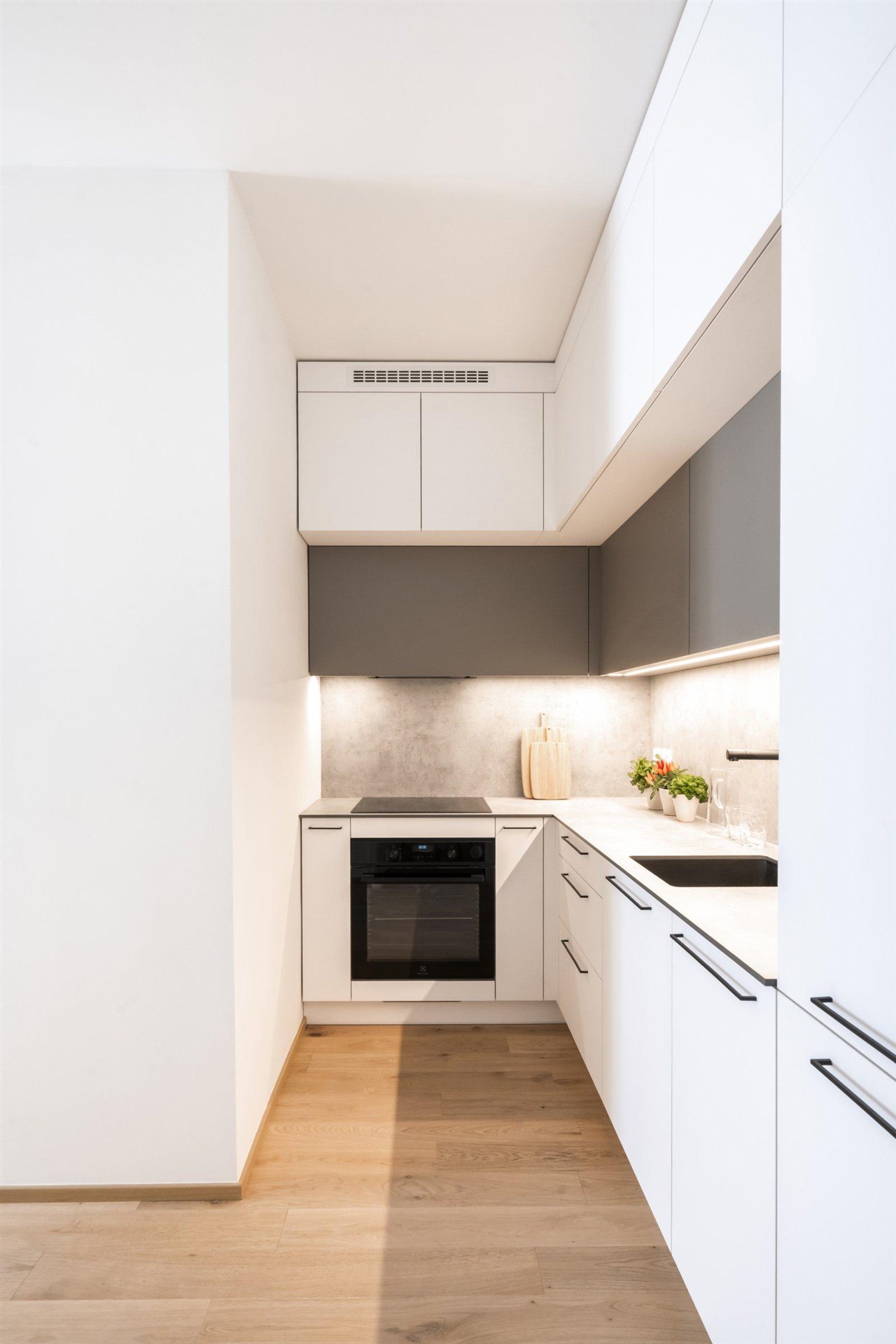 This one-bedroom apartment is part of the Pod Drinopolem residential project, which is being created by the complete reconstruction of an apartment building in one of the quietest parts of Prague 6. The location in the middle of a residential area offers a combination of greenery, privacy, and excellent accessibility to the center. The building includes a private sauna and a gym.