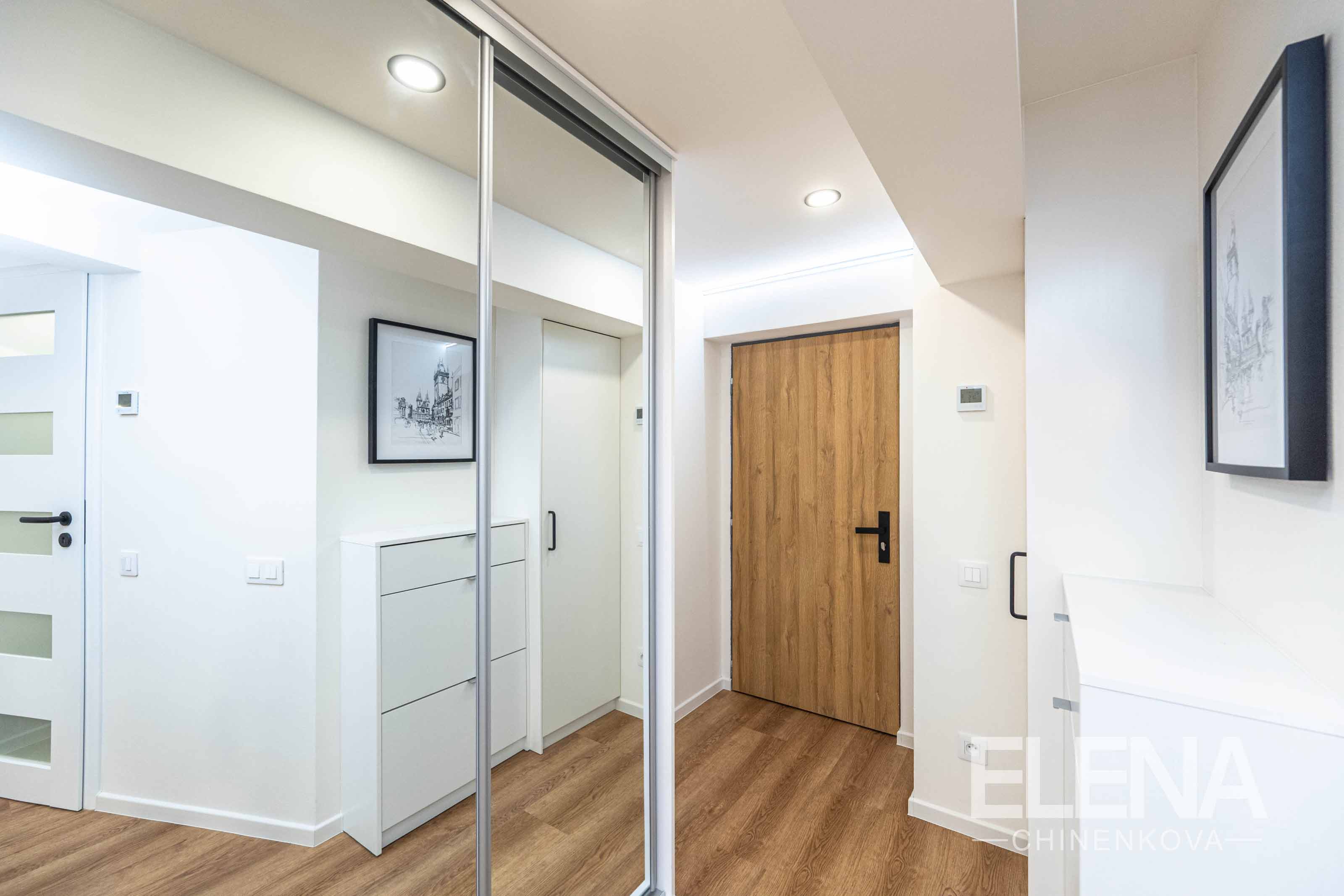 The hallway provides additional built-in storage and shoe cabinet. The modern bathroom features a walk-in shower and practical storage solutions. A private electric boiler for hot water is discreetly hidden in a built-in cabinet in the hallway.