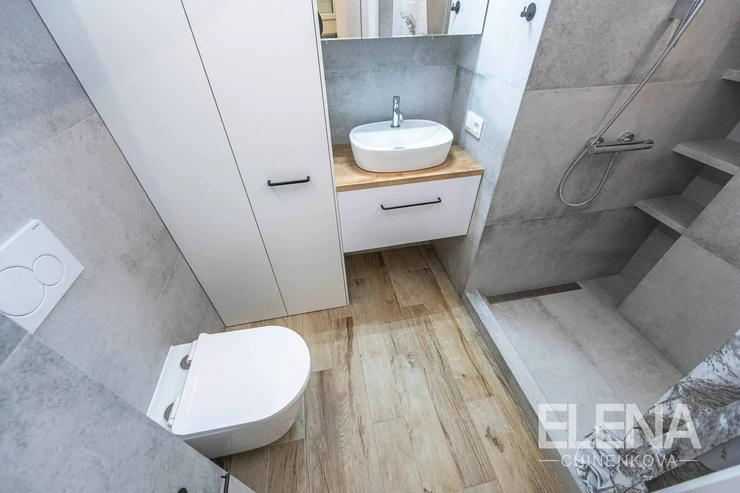 The bathroom is finished in a modern style with a walk-in shower and practical storage solutions. The washing machine and private electric boiler are discreetly integrated into a built-in cabinet – an aesthetic and highly practical solution.