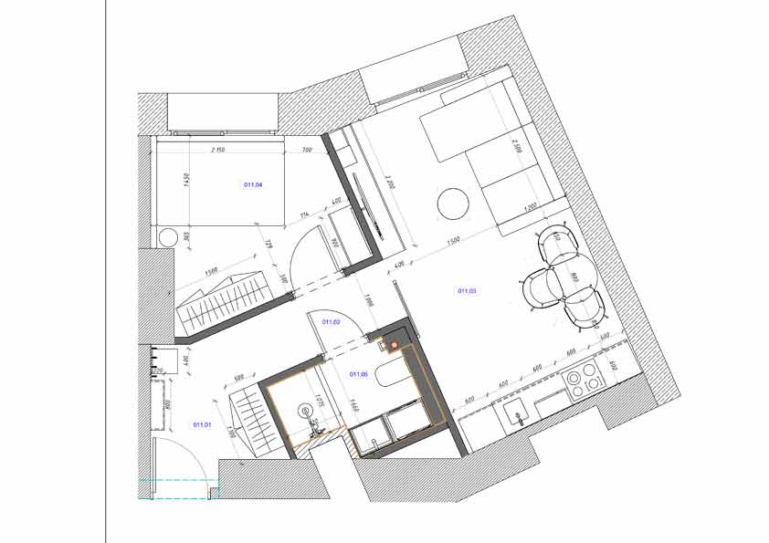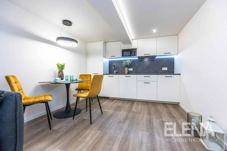 The living room with kitchenette forms one harmonious open space suitable for both relaxation and work. The kitchen is fully equipped with built-in appliances including a dishwasher, refrigerator, induction cooktop, microwave and extractor hood. The space is complemented by a dining area and a comfortable large corner sofa.