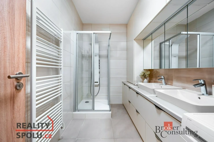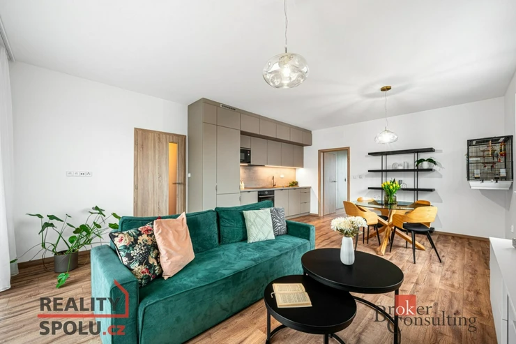 Dominantou bytu je prostorný obývací pokoj s kuchyňským koutem, který tvoří přirozené centrum celého bytu. Moderní kuchyňská linka je součástí vybavení a nabízí dostatek úložného i pracovního prostoru. Dvě samostatné ložnice poskytují maximální soukromí a klid, přičemž vestavěné skříně elegantně řeší úložné prostory bez narušení designu interiéru. Byt dále nabízí prostornou koupelnu s vestavným nábytkem na míru a sprchovým koutem s hydromasážním panelem Astrea, samostatné WC s bidetovou sprchou.