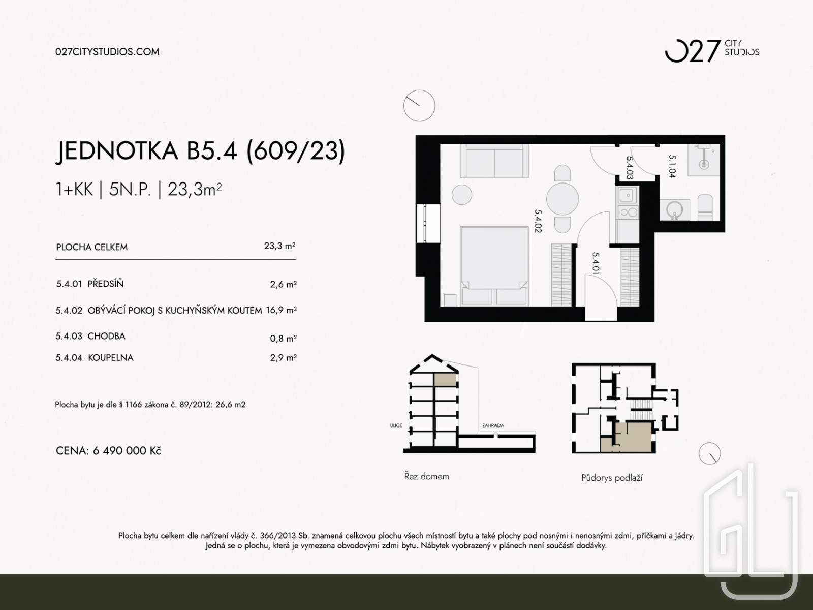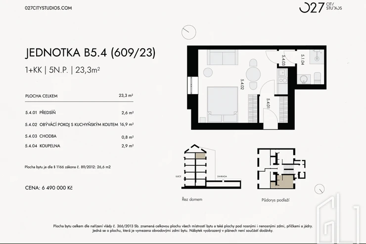 Unit No. 23 with a floor area of 23.3 sq m is located on the 5th floor of the renovated brick building with an elevator on Ondříčkova Street, Prague 3. The 1+kk layout offers a bright living area with a kitchenette and a bathroom with a shower and toilet. The apartment faces northeast into a quiet inner courtyard, away from street noise. The unit includes a storage cellar (cellar cubicle) of 0.7 sq m in the basement level (-1).