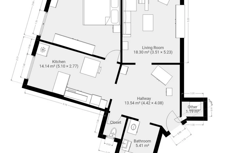 Option to convert to a 3+1 layout. The partition wall between the bedroom and the kitchen is non-load-bearing and can be removed. By dividing the existing bedroom (19.9 m²) with a new plasterboard partition, two full-size bedrooms are created, each with its own window. A detailed floor plan showing the proposed new layout is available in the photo gallery of this listing.