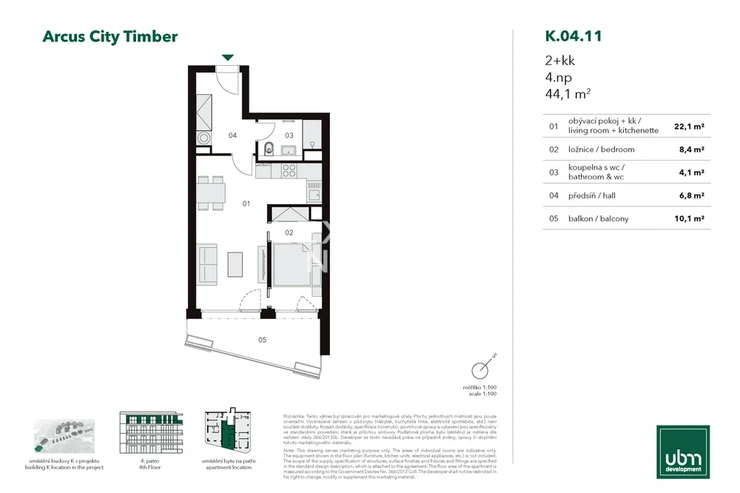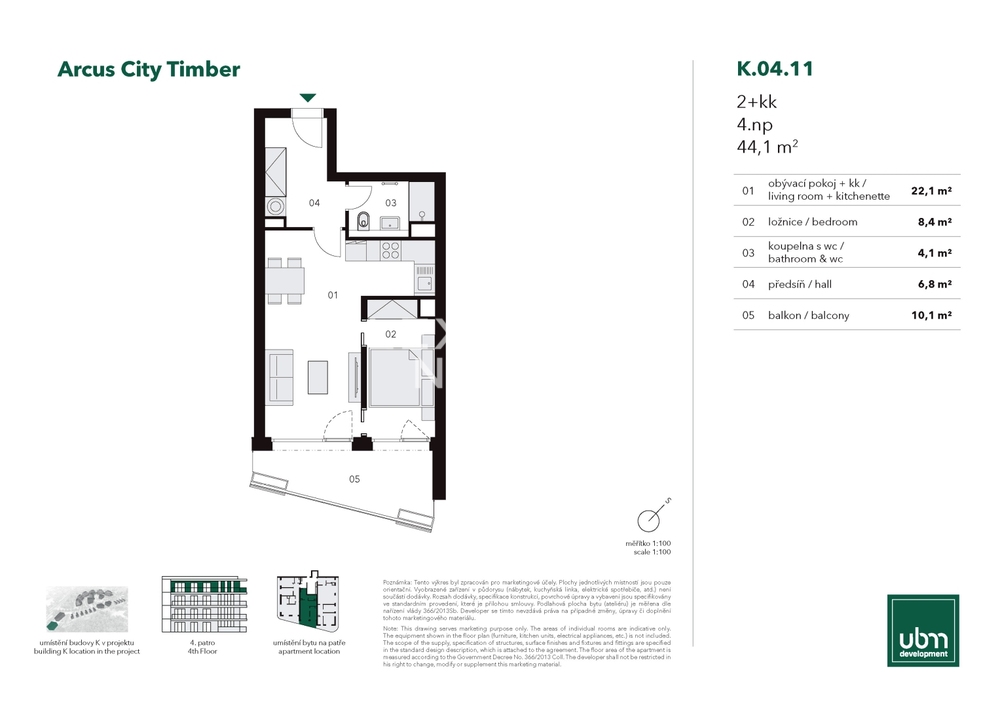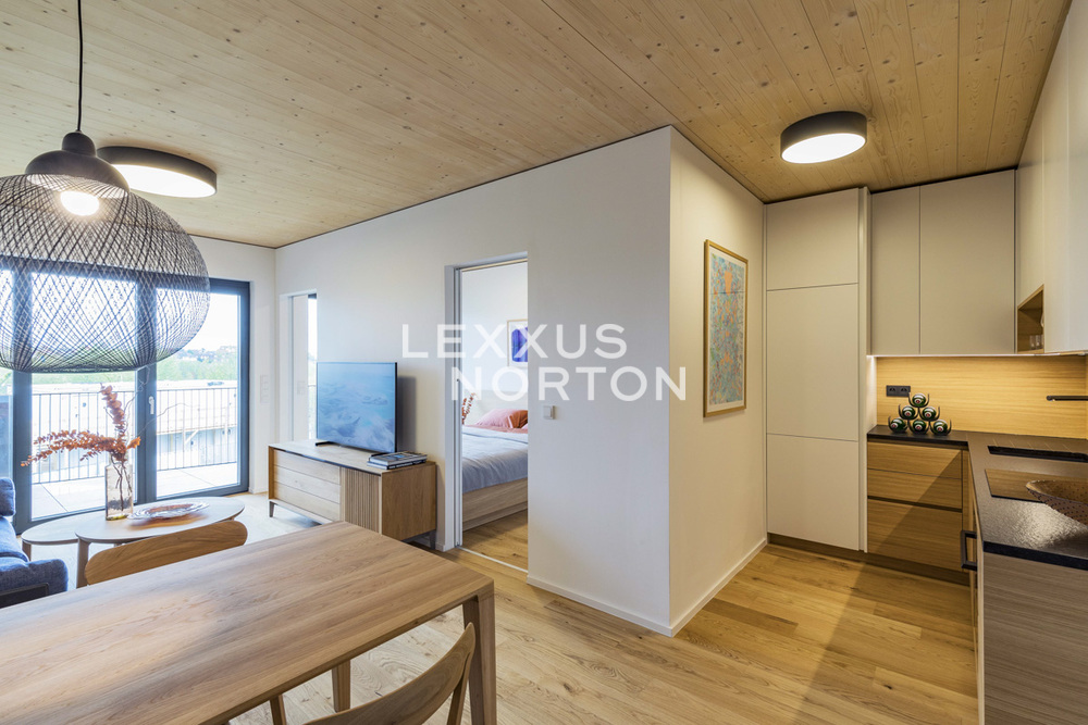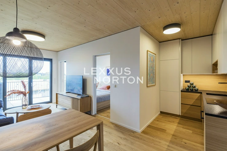 We are proud to offer a modern, already completed one-bedroom apartment of 44.6 sqm with balcony of 10.1 sqm located on the 4th floor. The apartment is dominated by a living room connected to a balcony and kitchenette. The bedroom also has its own entrance to the balcony. The apartment is immediately available to move in.There is also an assigned parking space and cellar, which are not included in the price of the apartment.Thanks to its construction in Energy Efficiency Category A, the building meets the strict ecological standards of the BREEAM Excellent certification, which guarantees sustainable living at the highest level.Timber Prague, a sustainable wooden apartment building and the very first project of its kind in Prague. High quality living with good energy, timeless design and creative spirit. One-bedroom apartment for sale that meets all these benefits complemented by complete civic amenities and perfect accessibility to Prague.Timber Prague is the future of living with good energy. The building has a wide range of energy-efficient technologies, such as photovoltaic panels, heat pumps, and geothermal wells, ensuring both environmental friendliness and energy self-sufficiency. For extra comfort and efficiency, it includes exterior blinds, underfloor heating with dual functionality for cooling during summer and heating in winter, and a Smart Home system that monitors energy consumption and regulates heating and cooling. The blend of sustainability and cutting-edge technology positions wood-frame buildings as a modern, eco-conscious choice for living.The project is realized within the residential complex Arcus City, located in the Prague-Repory. The project includes a new bus stop connecting the residential complex with the metro stations B Stodulky and Luka, which provides residents with a quick connection to the centre of Prague. Nearby you will find all civic amenities. Nurseries, schools, shops, sports facilities, restaurants and medical facilities. You can relax in the nearby Repora Biopark, Prokopske and Dalejske valley.