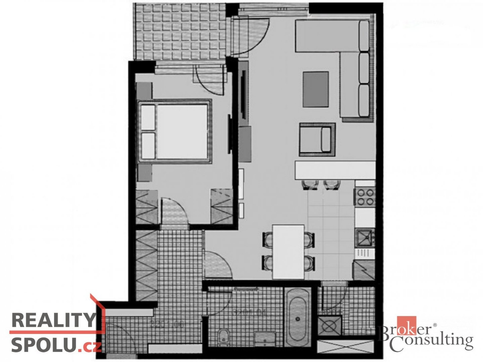 Byt tvoří obývací pokoj s kuchyňským koutem, samostatná ložnice, koupelna s vanou a WC a předsíň s úložným prostorem. Díky velkým oknům je byt příjemně světlý. Dispozice nabízí pohodlné bydlení pro jednotlivce či pár.