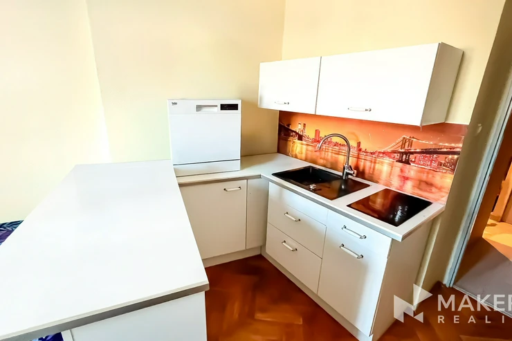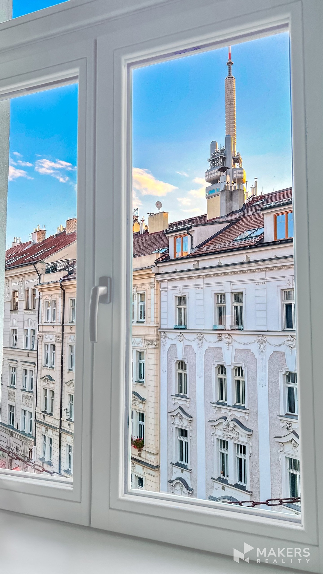 We offer for sale an attractive 2+kk apartment with appealing views of Žižkov Television Tower and Parukářka Park. The apartment is located on the 4th floor of a brick building with an elevator in the vibrant Žižkov district.