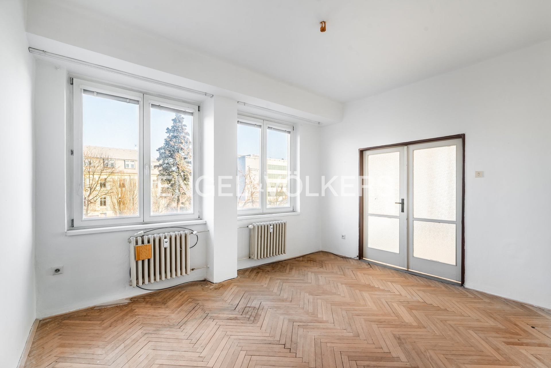 The apartment is intended for complete renovation, allowing the new owner to create a home exactly according to their own ideas and needs. At the same time, it is a very interesting investment opportunity – whether for long-term rental or subsequent appreciation after sensitive modernization. The layout offers an entrance hall with access to all rooms, a bathroom, a separate toilet, and two separate rooms that are also interconnected by a door. The apartment is oriented to the north towards Vinohradská Street and to the east towards a park, bringing a pleasant combination of urban environment and greenery. In its current state, there are wooden parquets, tiles, linoleum, and double-glazed wooden windows. Heating is provided centrally. The property also includes a 2 sqm cellar cubicle in the basement of the building. Parking is possible in the blue zones in the vicinity.