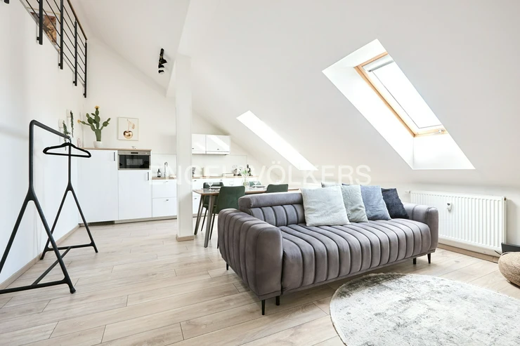 We offer for sale a unique duplex loft apartment situated on the 6th and 7th floors (7th–8th above-ground floors), which impresses primarily with its stunning views of the Vltava River and Vyšehrad. Thanks to its position, it provides maximum privacy and tranquility, while having all public amenities within reach.
