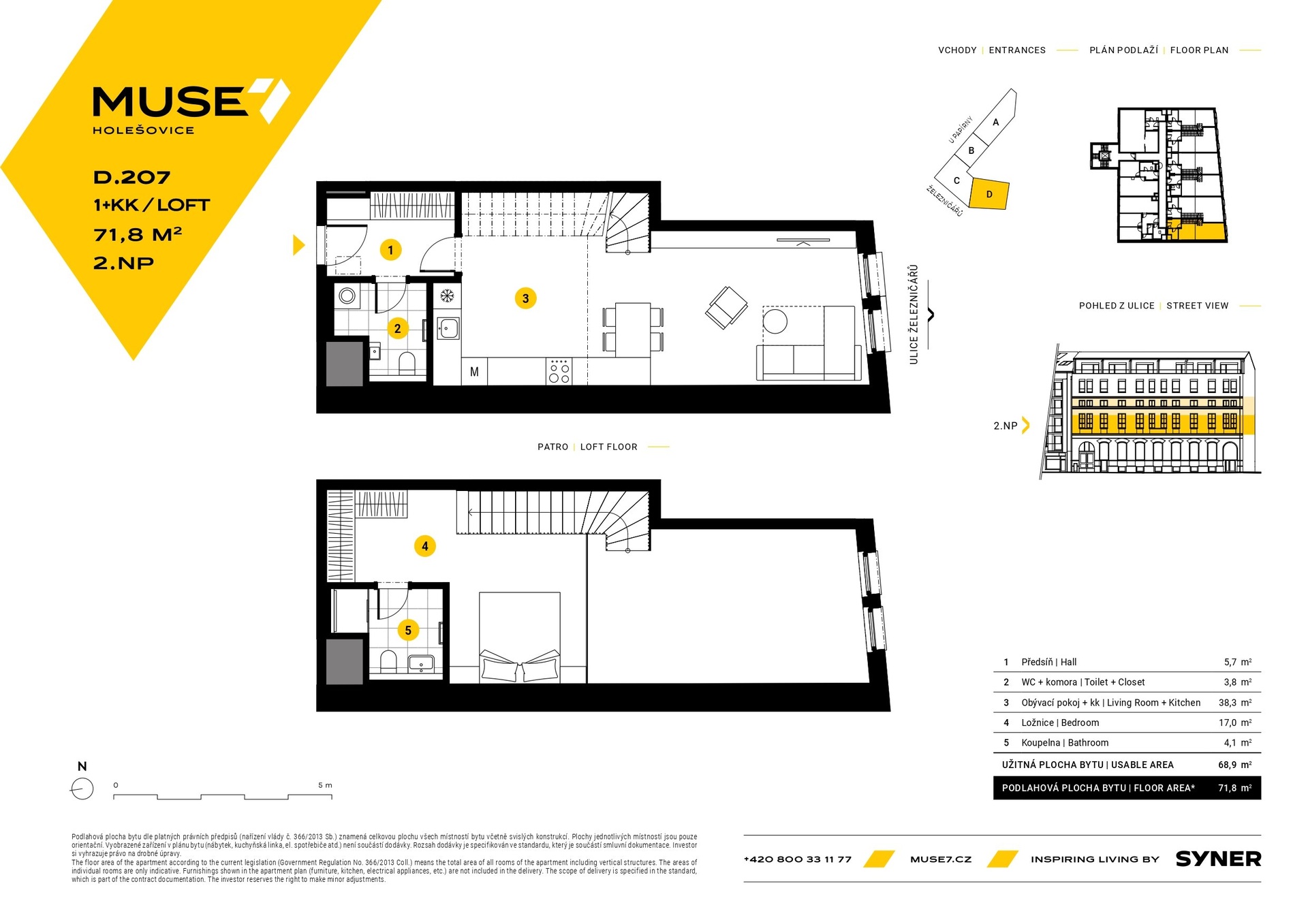 Loft o dispozici 1+kk (71,8 m²) vzniká v renovované části bývalé papírny, na kterou navazuje novostavba rezidence MUSE7 v pražských Holešovicích. Interiér tak přirozeně odkazuje na industriální historii místa a kombinuje ji s moderním standardem bydlení. Byt je orientovaný na západ do ulice Železničářů a nachází se ve 2. nadzemním podlaží.