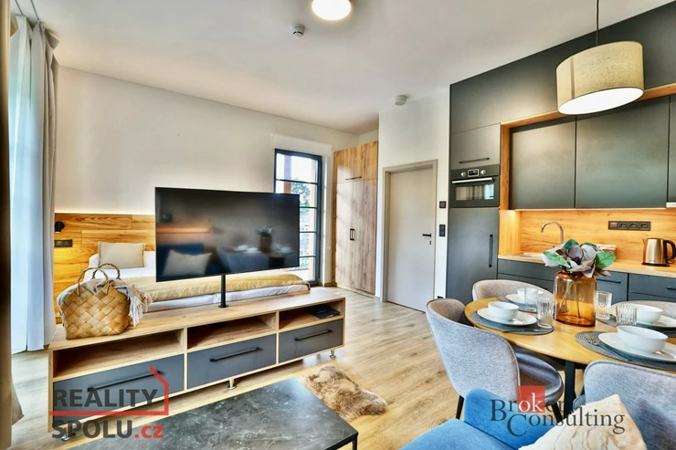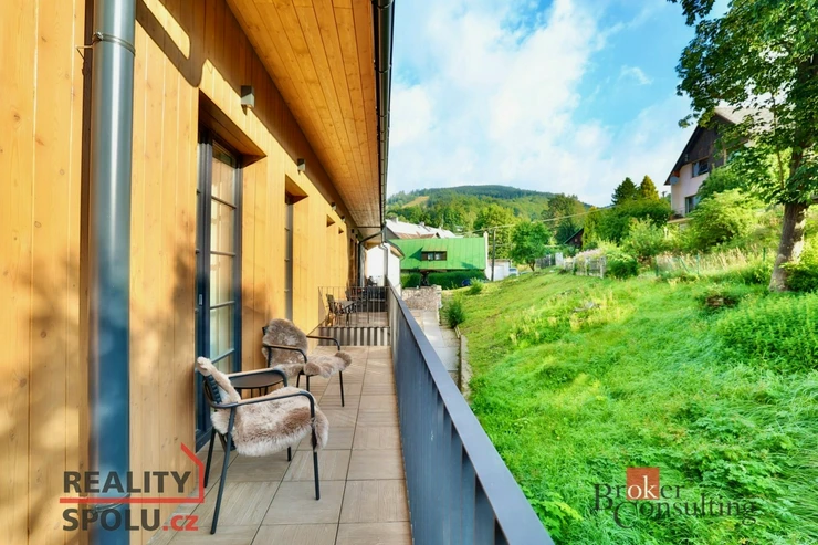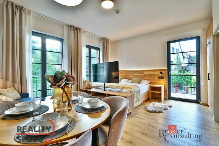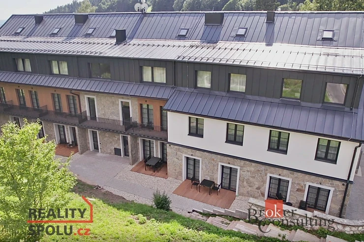 Nabízíme ke koupi luxusní, nově postavený, kompletně vybavený apartmán 1+kk o ploše 39,40 m² s 23m² balkonem v prestižní Rezidenci Aurum v Černém dole, v srdci Krkonoš.