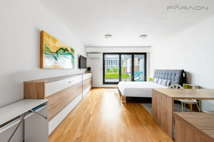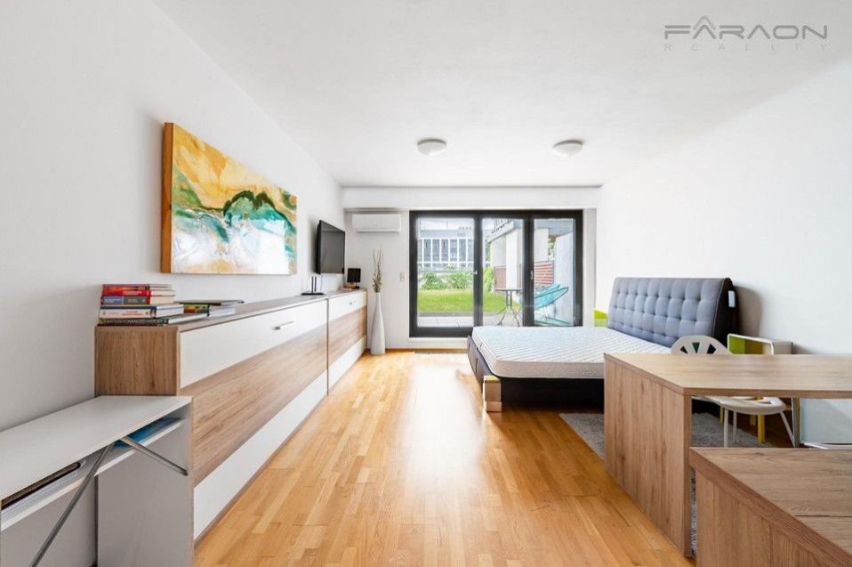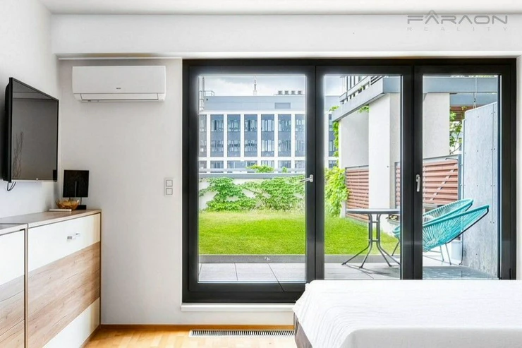 Sale of a modern, fully furnished apartment 1+kk (37.4m2 + 9.4m2 terrace and with a unique garden of 49.3m2) with a parking space and a large cellar (included in the rent) on the 6th floor of a house in a new residential project Garden Tower with reception, security, in an attractive part of Prague - on the border of Vinohrady and Žižkov with easy access to the center of Prague. 8 minutes by tram from Wenceslas Square. The tram stop is right in front of the house. Within a minute's walking distance of the metro station A Želivského and Flora.