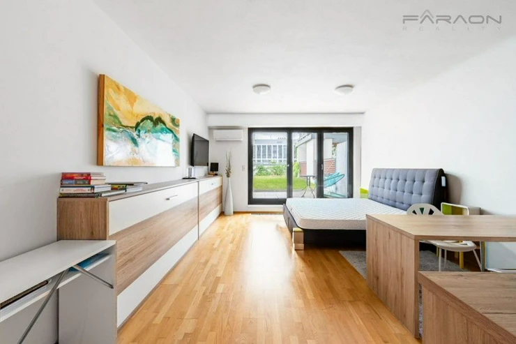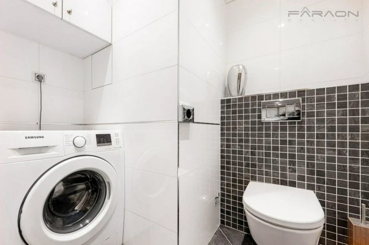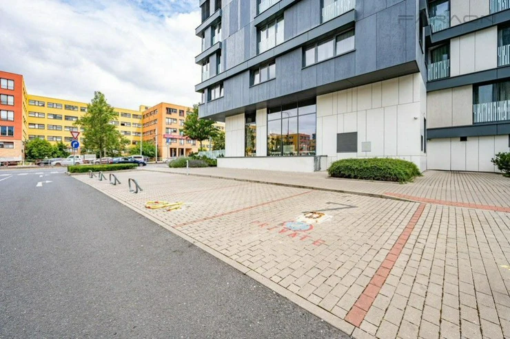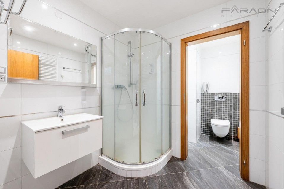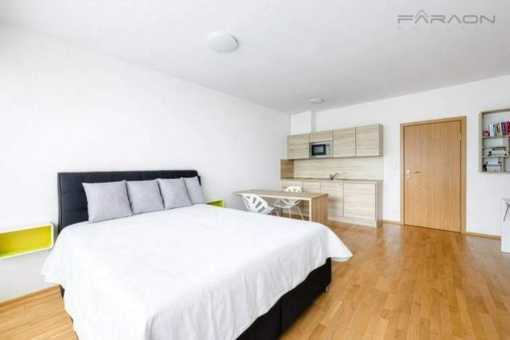 The layout of the 1+kk apartment consists of an open space living room with dining area and kitchen in a white glossy design combined with wood, with impressive glass French windows and views of the Prague panorama, as well as a spacious bathroom with a shower, a separate hanging toilet.the separate entrance hall with built-in wardrobes. All furniture is custom-made, the bedroom has a spacious, branded solid wood bed with a quality mattress. There is also plenty of storage space in the basement, where there is a custom-built shelving system.