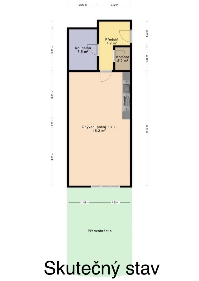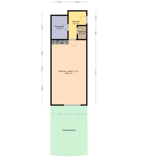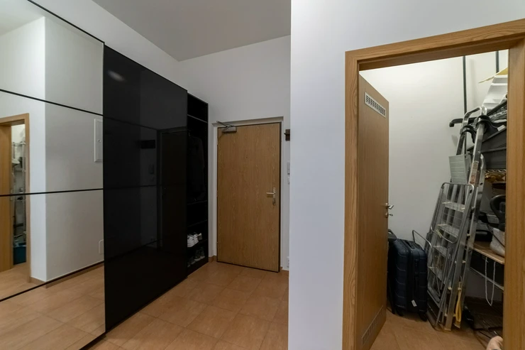 Kromě hlavní obytné místnosti byt nabízí prostornou předsíň s vestavěnou skříní, koupelnu s vanou a praktický úložný prostor v podobě komory či šatny. K bytu patří vlastní klidná předzahrádka ve vnitrobloku, která poskytuje maximální soukromí a možnost relaxace na čerstvém vzduchu. Podobné byty se na trhu objevují jen zřídka – většina 1+kk v Praze má zcela jiný charakter i měřítko.
