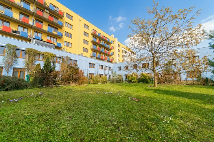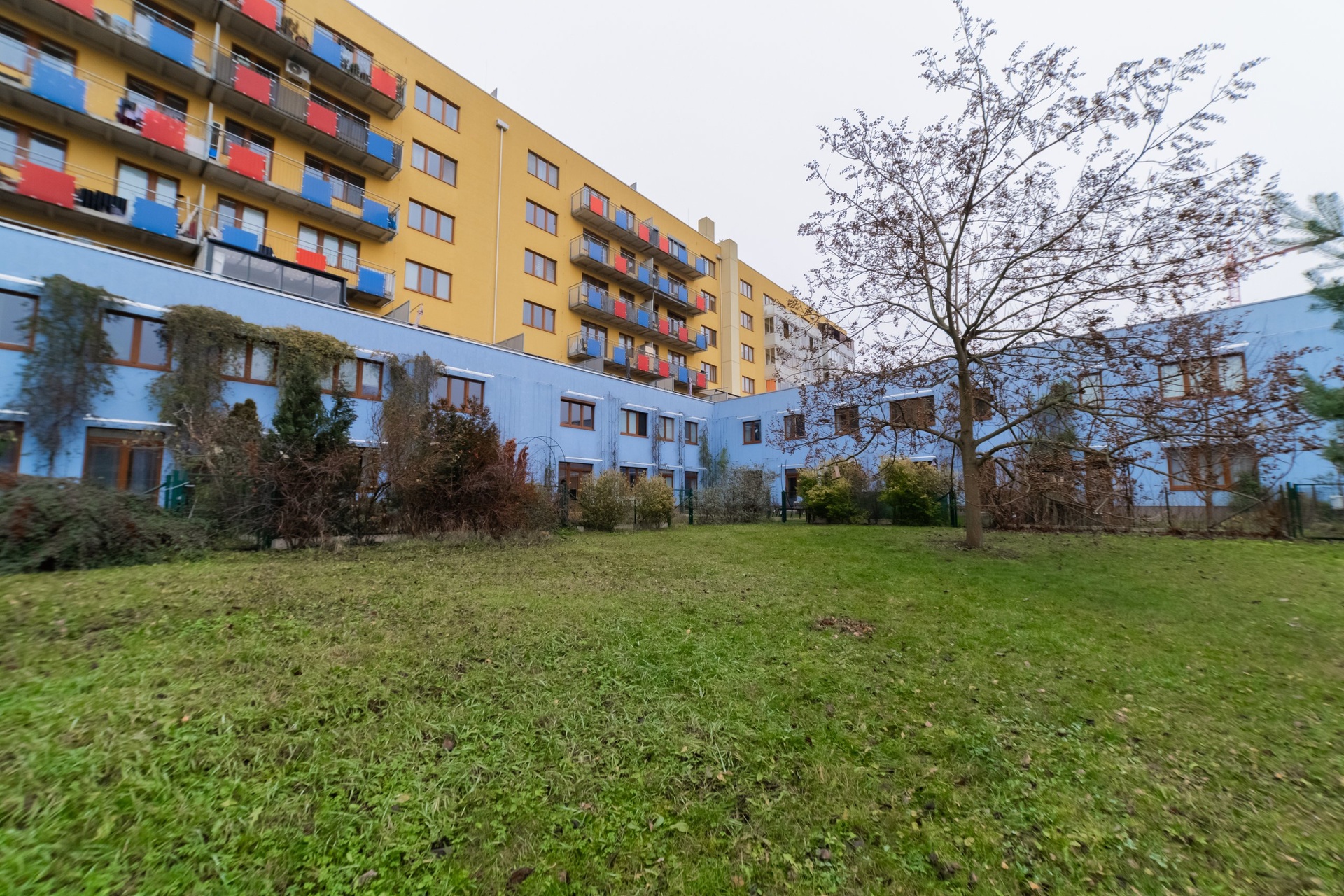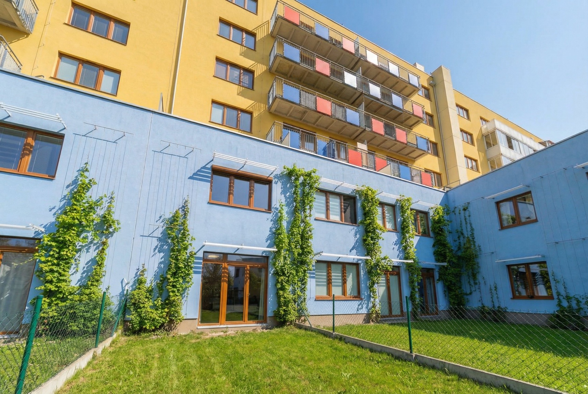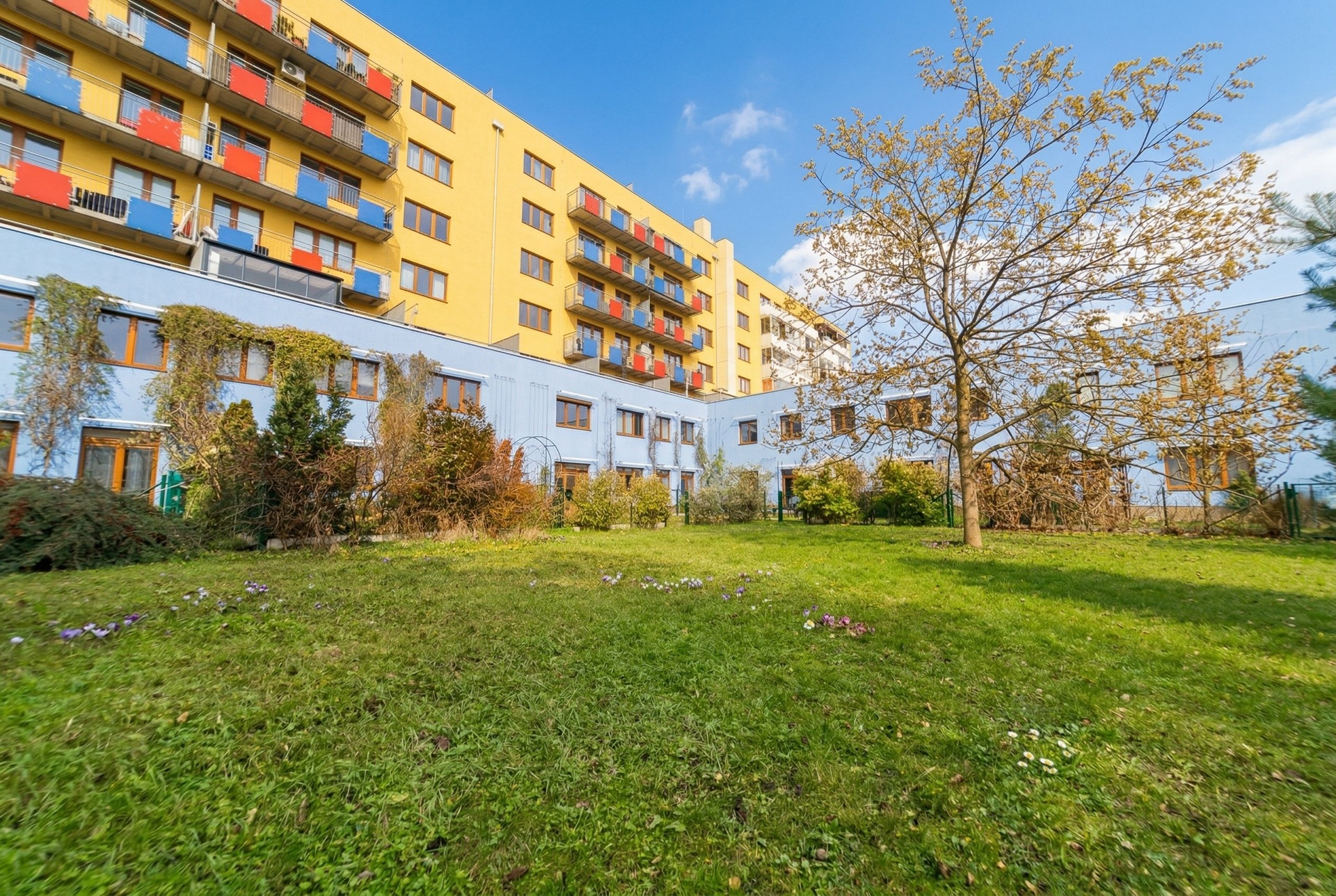 Prodej nadstandardně velkého bytu 1+kk s podlahovou plochou 64 m² a vlastní předzahrádkou 52 m², situovaného jen 7 minut chůze od stanice metra Střížkov.