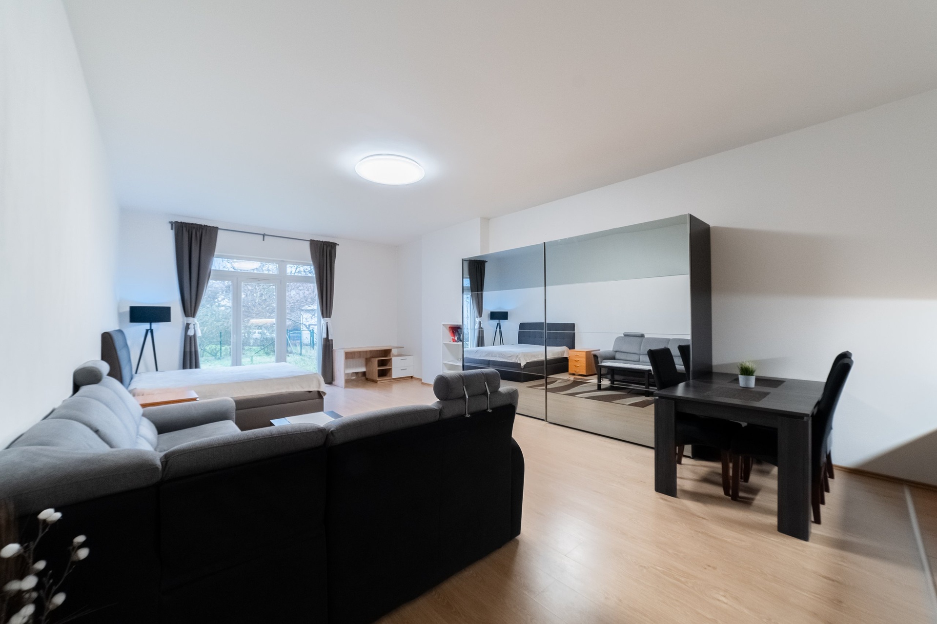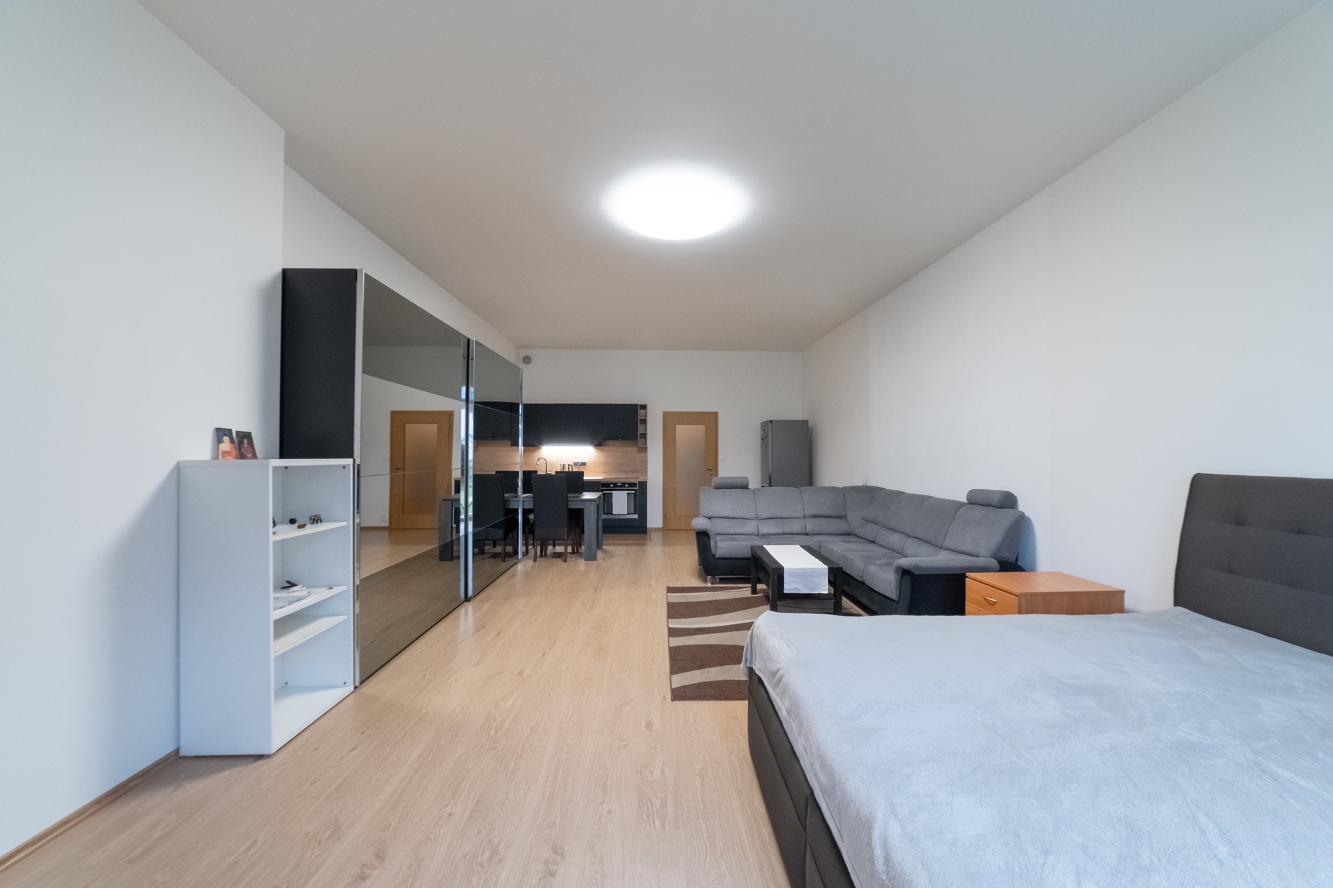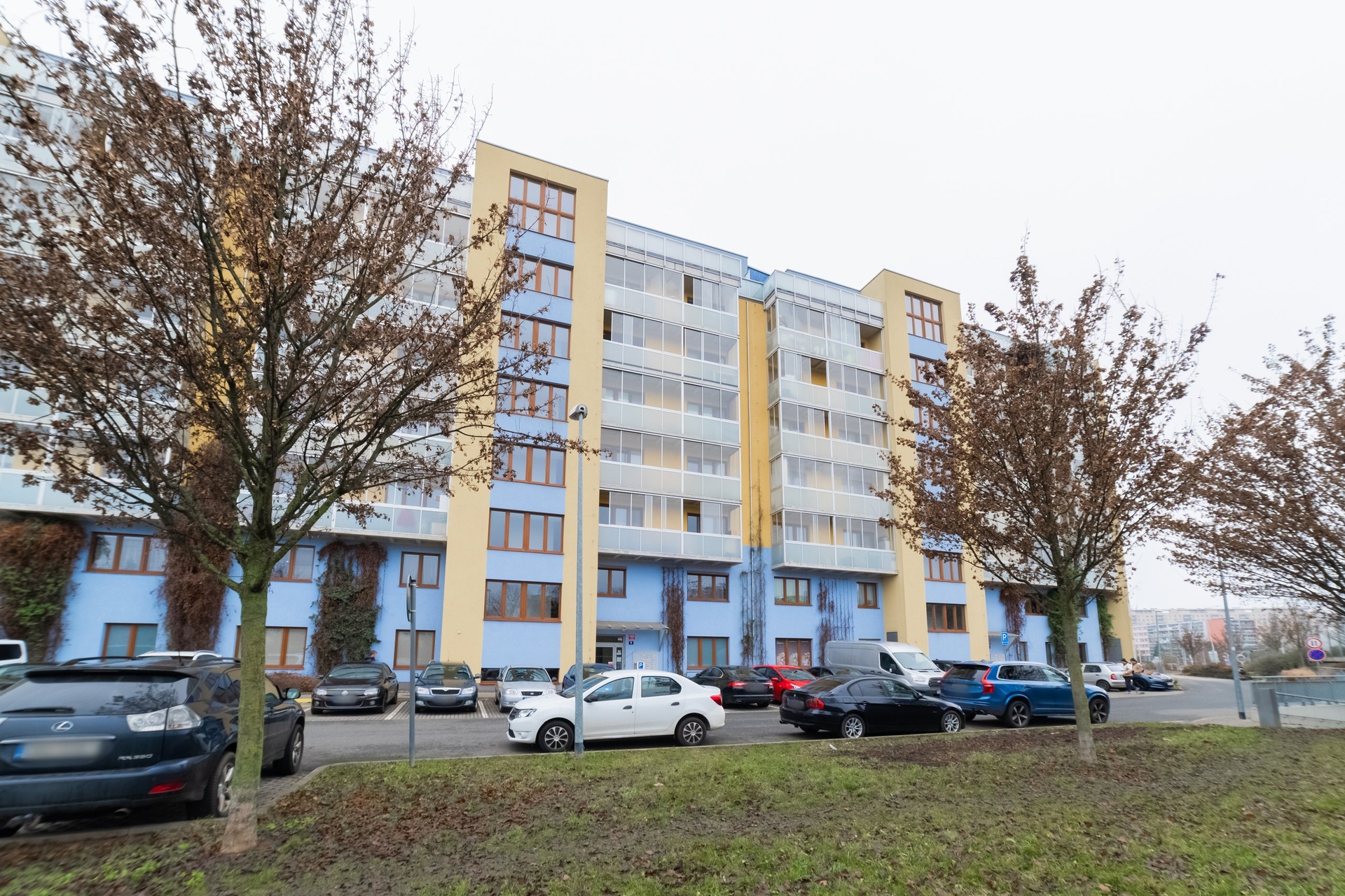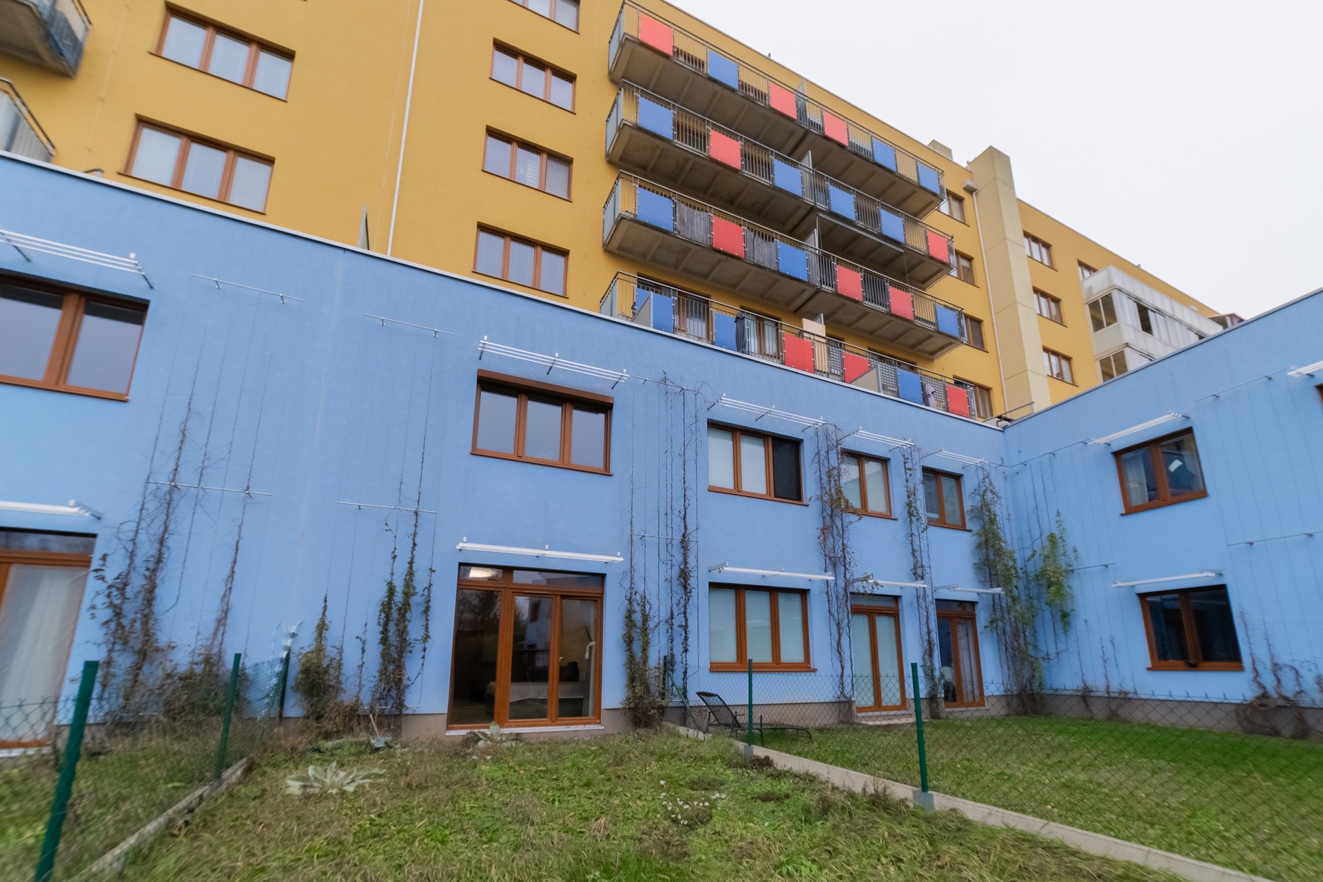 Prodej nadstandardně velkého bytu 1+kk s podlahovou plochou 64 m² a vlastní předzahrádkou 52 m², situovaného jen 7 minut chůze od stanice metra Střížkov.