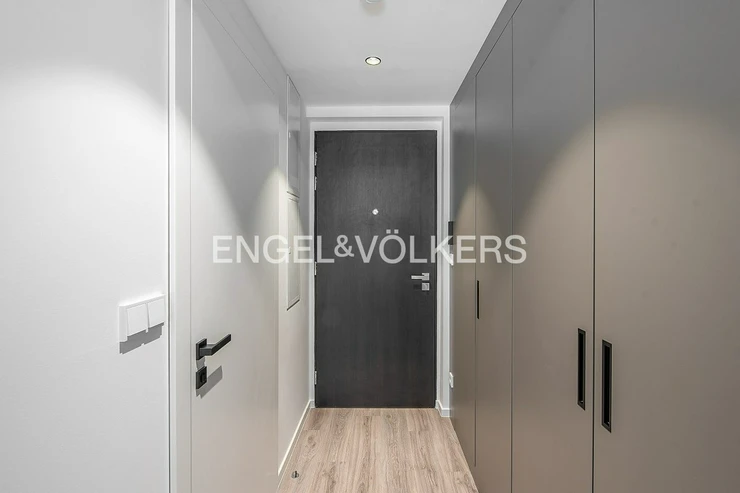 Apartment number 503 offers a hallway with a built-in wardrobe, a spacious bathroom with a shower, and a main living room with an elegant and practical kitchen unit. The apartment is airy and bright thanks to its southern orientation and location on one of the highest floors.
