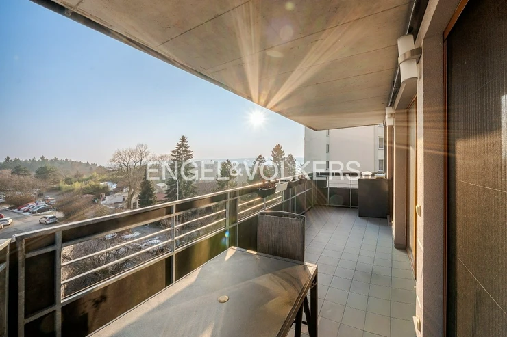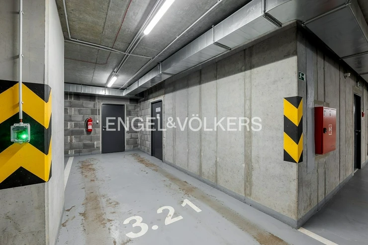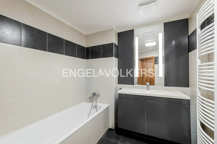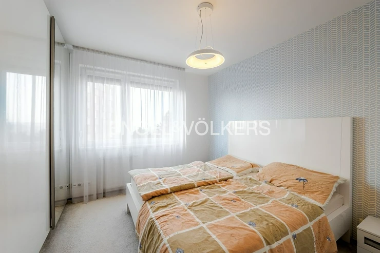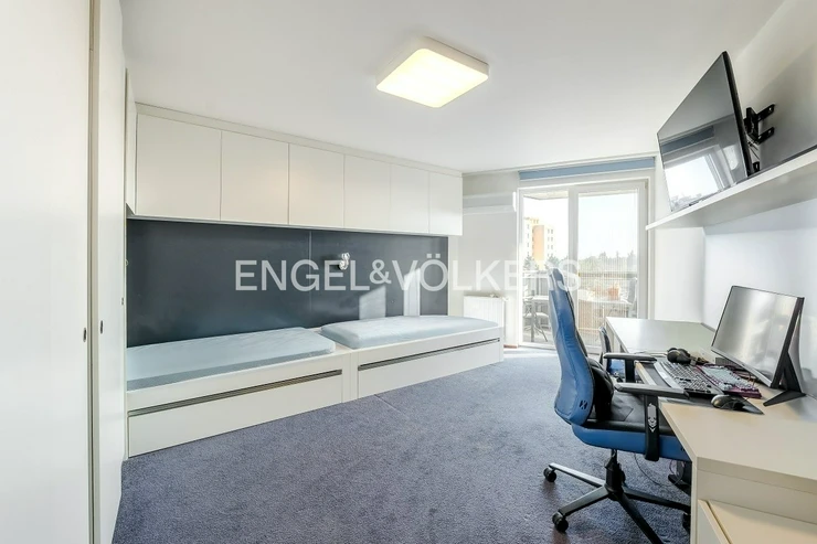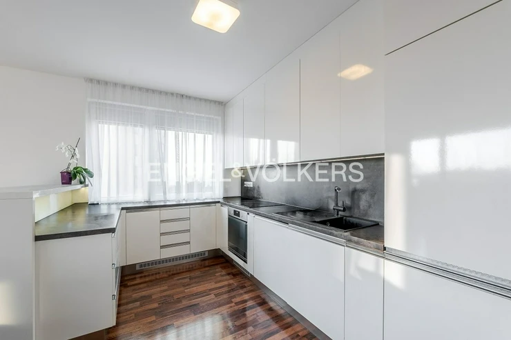 The living area is connected to a kitchenette and leads to a spacious 17 sqm balcony with a southern orientation, which ensures plenty of daylight throughout the day. The balcony can also be accessed from the first bedroom (children's room). The apartment is equipped with air conditioning in the living room and the children's room. The windows are plastic with double glazing. Heating is provided by a central gas system.