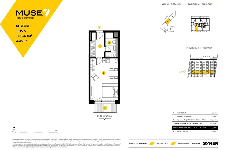 Účelně řešený byt o dispozici 1+kk (33,4 m²) s balkonem (3,8 m²) s orientací na západ do ulice U Papírny se nachází ve 2. nadzemním podlaží v nově vznikajícím rezidenčním projektu MUSE7 v pražských Holešovicích. Na prakticky řešený obývací pokoj s kuchyní navazuje balkon, který v letních měsících příjemně rozšíří možnosti využití tohoto bytu.