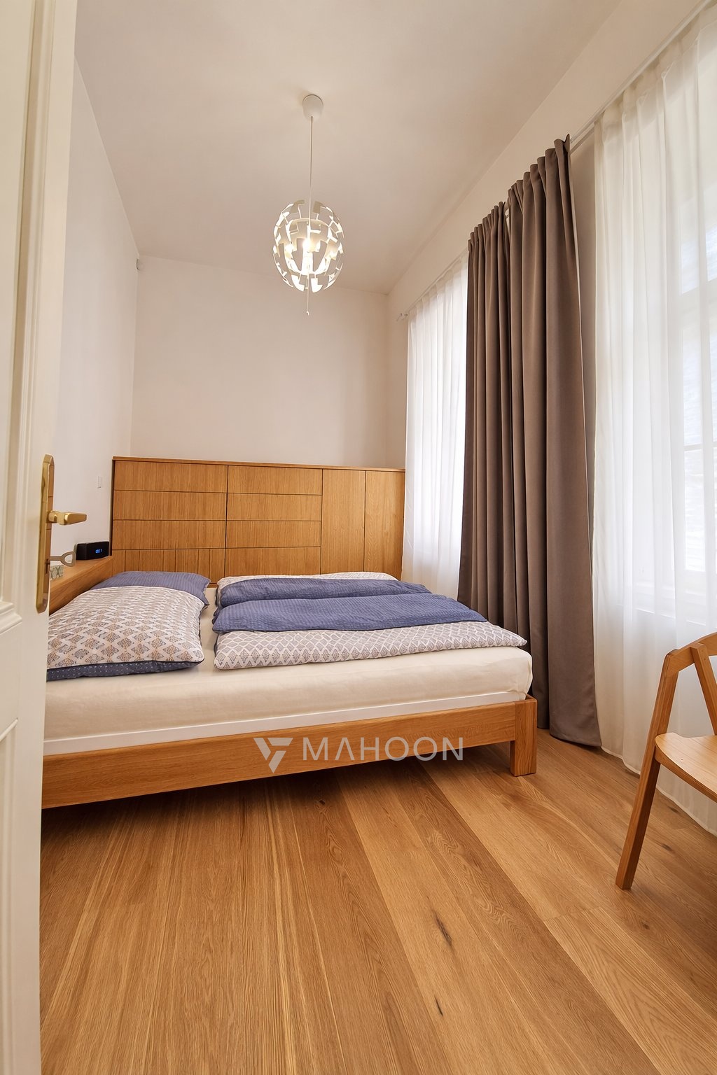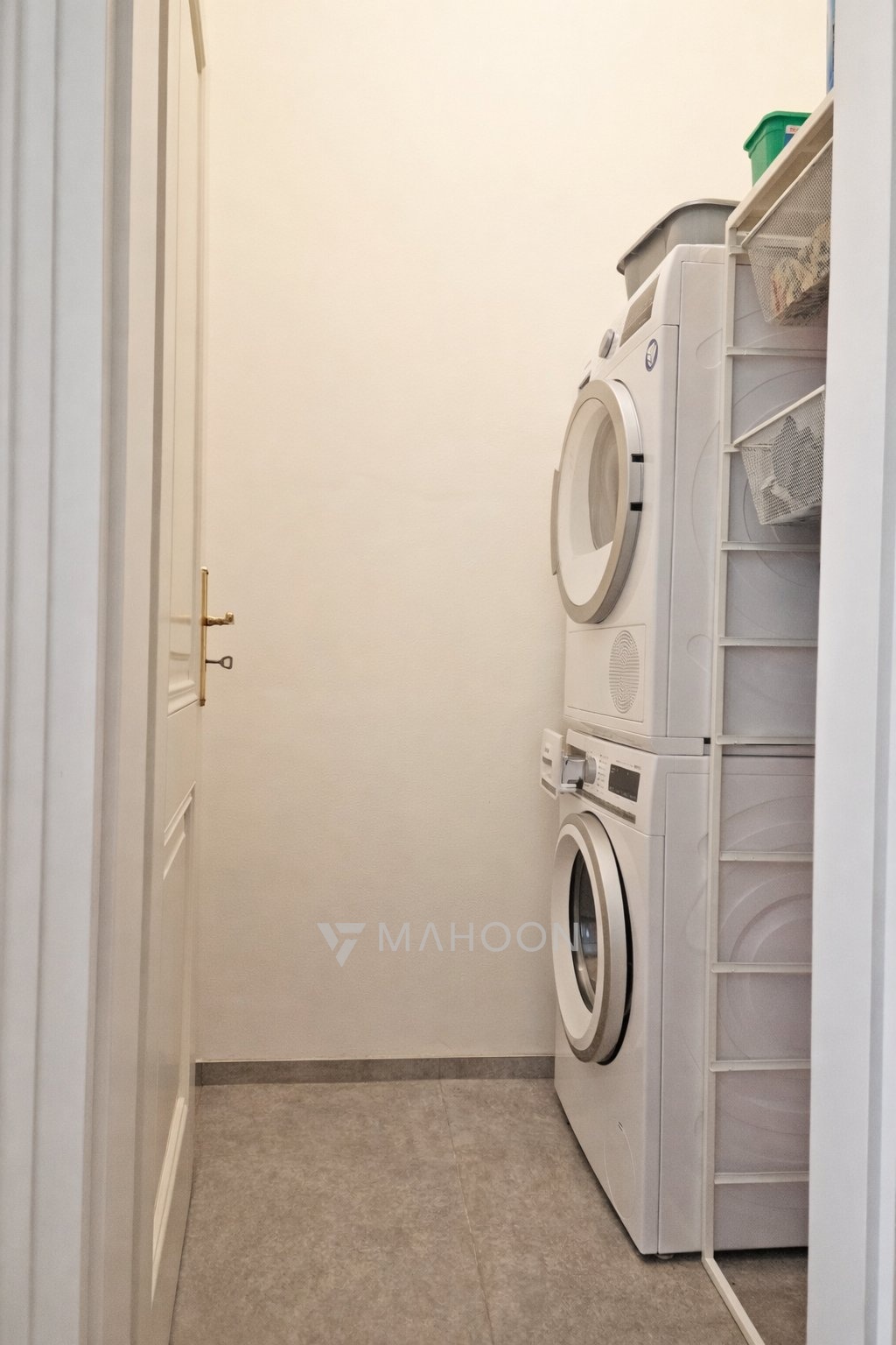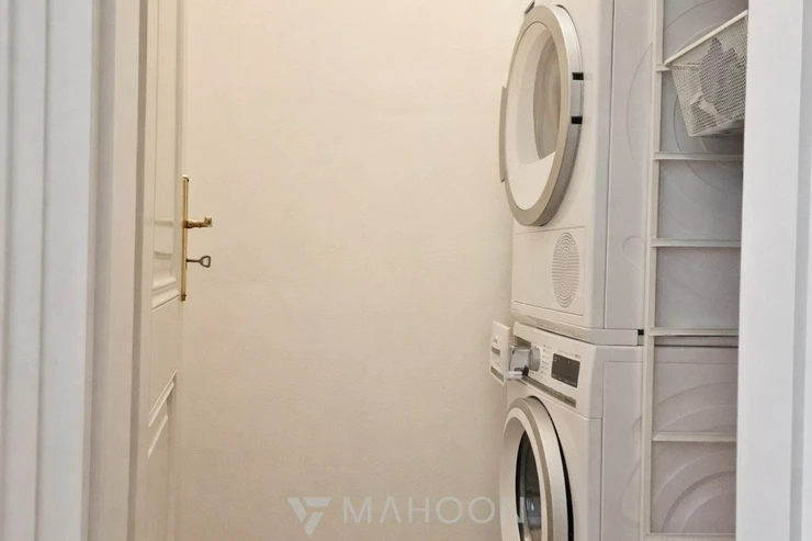 The apartment is being sold partially furnished – the bedroom as shown in the photos, the built-in wardrobe in the hallway, and the washer and dryer in the utility room.