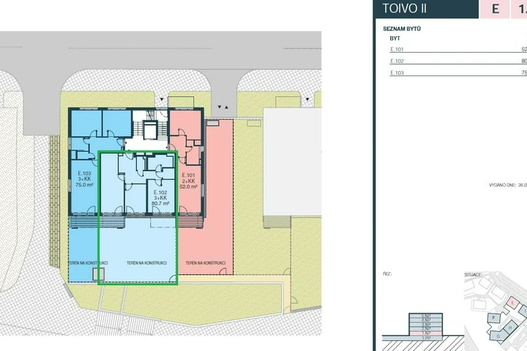 Nabízíme postoupení smlouvy na budoucí byt 3+kk o podlahové ploše 80,7 m2(užitna 74,9 m2) s terasou a předzahrádkou o celkové ploše 97 m2 v projektu TOIVO Roztyly II. Byt se nachází v budově E moderní rezidence, jejíž kolaudace je plánována na 1. čtvrtletí roku 2027. V rámci druhé etapy budou postavene 2 domy o 4 věžích, v domech o jednom společném podzemním a pěti až šesti nadzemních podlažích (vč. jednoho ustupujícího) s celkem 116 byty. V každé věži vznikne kočárkárna.