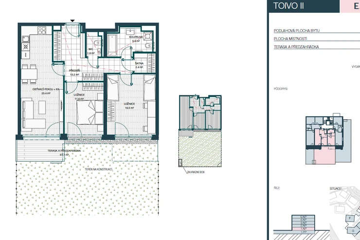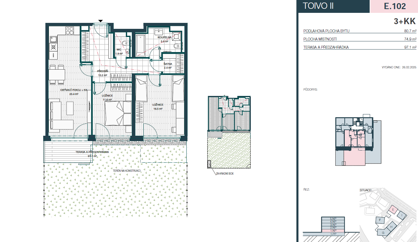 Součástí ceny je sklepní kóje o ploše 3 m2 a zahradní box, který poskytuje praktický úložný prostor například pro sekačku, sportovní vybavení či další zahradní potřeby.