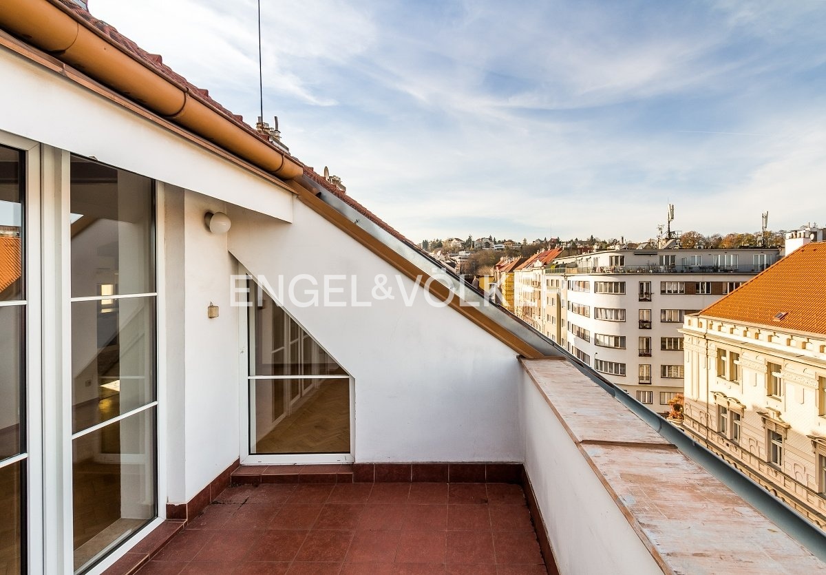 The apartment has a 14 m² east-facing terrace and a 6 m² balcony, which provide a pleasant space for relaxation and seating with a view of the city. The interior includes large bedrooms, a huge dining room, two bathrooms, and a fireplace that adds a cosy atmosphere to the space.